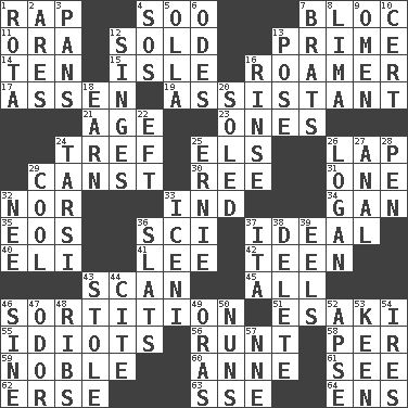 ACROSS 1. Reproach for some lapse or misdeed 4. "Barney Miller" actor Jack 7. Group of countries in special alliance 11. Mouth or opening 12. Disposed of to a purchaser 13. First class 14. Nine, plus one 15. Capri or Wright 16. Nomad 17. NE Netherlands city 19. Helper 21. Grow older 23. Singles 24. Not kosher 25. Raised railways 26. Infant locale 29. 2nd pers. sing. pres. of can (arch.) 30. To riddle 31. Single 32. And not 33. Indiana (abbr.) 34. Separate the seeds from cotton 35. Greek goddess of the dawn 36. _-fi 37. Perfect 40. Connecticut Ivy Leaguer 41. Area sheltered from the wind 42. Adolescent 43. Glance over 45. 100% 46. Conclusion 51. 1973 Nobel Price Winner (Physics) Leo 55. Foolish or stupid persons 56. Undersized animal 58. For each 59. Having high moral qualities 60. Queen of England 1702-14 61. Observe 62. Celtic language 63. Compass dir. 64. Followers of ems DOWN 1. Roll call or roster of names 2. Ancient Greek god of war 3. Zero-star reviews 4. Mayday 5. Water jar 6. Lyric poems 7. Naughty children 8. Pale green bean 9. Sign of something about to happen 10. Certainty 12. Scorches 13. Airs 16. Wash lightly 18. Merit 20. Having a sole or soles 22. Lizard (obsolete) 24. Tarsus (plural) 25. Bert's buddy 26. Utah city north of Ogden 27. Of or related to the anus 28. Writing instrument 29. Calm and collected 32. Born 33. Ancient Celtic tribe of eastern Britain 36. Narrow boards 37. Call ___ day 38. Erase 39. Snakelike fish 43. Fur scarf 44. Quote 46. Trig term 47. Scent 48. Teases 49. Mouths or openings 50. Religious women 52. Domed church section 53. Peachy ____! 54. Angers 57. Compass dir.