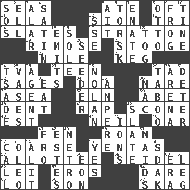 ACROSS 1. Oceans 5. Had dinner 8. Often (poetically) 11. Rounded earthenware pot or jar 12. The Jewish people; Israel 13. Three (prefix) 14. Chalkboards 17. Ski resort town in Vermont 19. Full of chinks, cracks, or crevices 21. Moe Howard, for one 22. "Death on the ____" 23. Cask 24. Federal power corp. 27. Adolescent 29. Small boy 32. Gurus 34. ___ good deed 36. Female horse 37. Toward the sea 38. Shade tree 39. Collude with 40. Scratch 41. Reproach for some lapse or misdeed 42. Biscuitlike quick bread 43. Eastern Standard Time (abbr.) 44. Famous astronaut Armstrong 46. Rowing implement 47. Opposite of masc. 50. Wander aimlessly 52. Rough 55. Gossips 57. One to whom something is allotted 59. A glass for beer 62. Luau accessory 63. Greek god of love 64. Have the gumption 65. Car dealer's back yard 66. Male child 67. Heroin DOWN 1. Mayday 2. Pipe bend 3. Having or resembling wings 4. Smooth fabric 5. Small island 6. Cod relative 7. Maternal 8. "Beetle Bailey" pooch 9. Tree-dwelling hopper 10. Prong on a fork 12. Compass dir. 15. Gives off 16. Flatfish 18. Coat; cloak 20. Sowing specialist 24. Sadhe (variant) 25. Flower holders 26. Representative 28. Pitcher Ryan 29. Off limits 30. Sports stadium 31. Prevent from occurring 33. Erode 35. Electrical Unit 36. Big _ 42. Chalkboard 45. Charged particles 47. Back 48. _____ Park, CO 49. Paris' subway 51. Unmarried girls 52. Give a ring to 53. Margarine 54. Set down 55. Affirmative reply 56. Neighbor of Neb. 58. A really long time 60. Epoch 61. Part of a journey
