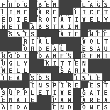 ACROSS 1. Tree-dwelling hopper 5. Benjamin's nick name 8. Falls behind 12. Welles in "The Third Man" 13. "We ___ not amused" (Victoria) 14. It is permitted: Lat. 15. Singer Brickell 16. Rotating or pertaining to rotation 19. Soggy 20. Choose not to consume 21. Fast planes 23. Had dinner 24. Born 27. Monetary unit of Yemen 30. Electrical Unit 31. Severe or trying experience 34. He sold his birthright 35. Carrot, for example 38. Natives or inhabitants of Denmark 40. Painter Guido (1575-1642) 41. Unsightly 42. Baby cat 44. 1994 drama film starring Jodie Foster 45. "Two Mules for Sister ____" 46. Afternoon social gathering 47. Mayday 50. Small island 53. Stimulate to action 57. Eastern Standard Time (abbr.) 59. Supplementary 63. Yard entry 64. Maternal 65. Baking dish 66. Type of rug 67. Opera by Verdi 68. Conclude 69. Washington bills DOWN 1. Soared 2. Amusement-park features 3. Leaves out 4. Unit of force equal to gravity 5. Sharp remark 6. Greek god of love 7. Remaining after all deductions 8. 54 in ancient Rome 9. Adept person 10. Set 11. Filthy place 14. Actor's bit 17. Auto club (abbr.) 18. Teat (slang) 20. SW Saudi Arabia district 22. Trinitrotoluene 24. Characteristic smell of wine 25. Liveliness 26. Needle case 28. Find the sum of 29. Path through which fluid escapes 30. Actresses Bloom and Felton 32. Black tropical American cuckoo 33. Allows 35. The smallest animal of a litter 36. Double curve, resembling the letter S 37. Water jar 39. R.R. building 43. 4th largest of the Great Lakes 47. Filth; sediment 48. Single 49. Fast jet (abbr.) 51. Acquire or gain knowledge or skills 52. First name in cosmetics 54. Corncob 55. "Terrible" tsar 56. Tear apart 58. Afternoon social gatherings 59. Ocean 60. University (slang) 61. Groovy apt. 62. Parent Teacher Assoc. 63. E Mali city