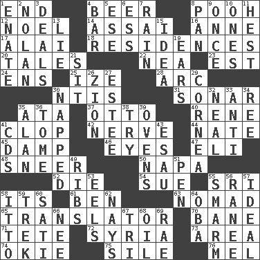 ACROSS 1. Conclude 4. Fermented drink made from hops 8. "Silly old bear" 12. Christmas carol 14. Slender Brazilian palm 16. Queen of England 1702-14 17. Jai ____ 18. Homes 20. Falsehoods 22. Teachers' org. 23. Eastern Standard Time (abbr.) 24. Followers of ems 25. Ending with capital 28. Curve 30. Nuclear Threat Initiatives 31. Underwater navigation system 35. _ moment's notice (2 wds.) 37. Von Bismarck 40. French philosopher Descartes 41. Hoof sound 42. Effrontery 44. Nathan's nickname 45. Moist 46. Snake ____ (dice throw) 47. Connecticut Ivy Leaguer 48. Contemptuous expression 50. California wine valley 52. Expire 54. Take to court 55. _ Lanka 58. ___ a Wonderful Life 61. Benjamin's nick name 63. Wanderer 65. Interpreter 70. Object of repulsion 71. Wig 72. Damascus' land 73. Length times width 74. Migrant worker of the '30s 75. Drop; flow; fall 76. Cartoonist voice _ Blanc DOWN 1. Maternal 2. Pitcher Ryan 3. Allots cards 4. Soap unit 5. Compass dir. 6. Curvy letter 7. Precipitation 8. Baking dish 9. Single time 10. Singles 11. Command 13. Whopper 15. The main thing one is thinking about 19. Hearing organs 21. Be seated 26. The Jewish people; Israel 27. First name in cosmetics 29. Pupil covering 30. Slept 32. Actress Patricia 33. Against 34. To sift 35. Actor Alda or Thicke 36. Heavy book 38. Attempt to accomplish something 39. Baking chambers 41. Music discs 43. Son of Isaac 49. Chest bones 51. Fenced enclosure 53. Snakelike fish 55. Excessive but superficial compliments 56. The wife of a rajah (variant) 57. Standard of perfection 58. "Tell ____ the Marines!" 59. Long journey 60. Suttee (variant) 62. Negative votes 64. Chief or king in Benin or Nigeria 66. Born 67. Three (prefix) 68. Petroleum 69. Actress Charlotte