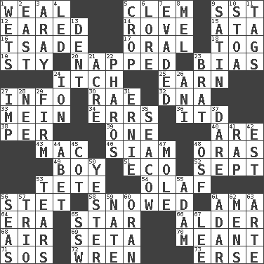ACROSS 1. Welt 5. To starve (Brit.) 9. Fast jet (abbr.) 12. Having ears or earlike features 14. Be footloose 15. _ moment's notice (2 wds.) 16. Sadhe (variant) 17. Of the mouth 18. Coat; cloak 19. Filthy place 20. Slept 23. Prejudice 24. Hankering 25. Merit 27. Information 30. Actress Charlotte 32. Heredity factor (abbr.) 33. Count _ (2 wds.) 34. Blunders 36. It would 38. For each 39. Single 40. "We ___ not amused" (Victoria) 43. Big _ 46. Thailand, formerly 48. Mouths or openings 49. Male child 51. Environmental prefix 52. Back-to-school mo. 53. False hair 54. Norwegian king 56. Proofreading order 58. Frozen precipiation fell 61. Housemaid (var.) 64. Period 65. Play the lead 66. Tree or shrub in the Birch family 68. Wind 69. Bristle 70. Intended 71. Mayday 72. Songbird 73. Celtic language DOWN 1. Moistens 2. Compass direction 3. Like ___ of sunshine 4. Directed 5. Riding implement 6. Old wives' tales, e.g. 7. Eluded 8. Cartoonist voice _ Blanc 9. Smooth fabric 10. Portico 11. Labels 13. Gouge 21. Land measure 22. N Egypt peninsula 23. Naughty child 24. Electrically charged atom 26. Cuckoo 27. Mischievous child 28. Born 29. Securely fixed in place 31. Bert's buddy 35. Manatee 37. Have the gumption 41. Reproach for some lapse or misdeed 42. Eastern Standard Time (abbr.) 44. Collude with 45. Small bed 47. Undercover agent 48. Order of Saint Francis (abbr.) 50. Last past 53. Rends 55. First of billions? 56. Oceans 57. Musical group of three 59. Nathan's nickname 60. NW Algerian seaport 61. The sixth month of the Jewish calendar 62. Not women's 63. Johnson of "Laugh-In" 65. Compass dir. 67. Area sheltered from the wind