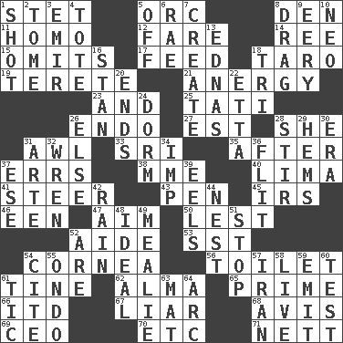 ACROSS 1. Proofreading order 5. The grampus (Milton) 8. Lair 11. Like (prefix) 12. Conductor's collection 14. To riddle 15. Leaves out 17. Nourish 18. Edible starchy tuberous root 19. Cigar-shaped 21. Disorder of the immune system 23. Also 25. Jacques of French films 26. Inside; within (prefix) 27. Eastern Standard Time (abbr.) 28. A female animal or person 31. Leather borer 33. Indian title of respect (Mr.) 35. Following 37. Blunders 38. Madame (abbr.) 40. Pale green bean 41. Guide 43. Animal enclosure 45. Big collection agency 46. Car or cant ending 47. Direct toward a target or goal 50. For fear that 52. Assistant 53. Fast jet (abbr.) 54. Pupil covering 56. Bathroom 61. Prong on a fork 62. _ mater 65. A-one 66. It would 67. One who doesn't tell the truth 68. Opinion 69. Corporate head (abbr.) 70. And so on (abbr.) 71. Remaining after all deductions DOWN 1. Guess 2. Heavy book 3. Arab leader 4. Carry 5. Below a satisfactory level 6. Actress Charlotte 7. Make 8. To draw with force 9. Suggestive of the supernatural 10. Modern: prefix 13. Ferber et al. 16. Comedian Laurel of Laurel & Hardy 18. Three (prefix) 20. Extremities 22. Singer James 24. Dormintory (informal) 26. Otherwise 28. Disorderly outburst 29. Equivocates 30. Epoch 31. Johnson of "Laugh-In" 32. Songbird 34. Naughty child 36. Secret move to avoid paying debts 37. Compass dir. 39. Snakelike fish 42. Water falling in drops from the sky 44. Egg locale 48. Standard of perfection 49. Ear of corn 51. Obstruct or block passage 52. "We ___ not amused" (Victoria) 54. Quote 55. Southwest Nigerian state 57. SW Asia republic 58. Not recorded 59. Give off 60. Trial 61. Nervous spasm 63. Floor covering 64. Curve