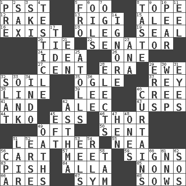 ACROSS 1. Inconspicuous attention getter 5. Egg _ yung 8. Drink excessively 12. Immoral or dissolute person 13. Swiss mountan, "Queen of the Mountains" 15. Toward shelter 16. Be 18. Cassini of fashion 19. Lick closed 20. Standoff 22. Elected representative 24. The content of cognition 26. Single 27. Penny 28. Period 29. She-sheep 32. Land 35. Stare at amorously 37. Marina Del _, California 38. Actor's bit 39. Area sheltered from the wind 40. Algonquian 41. Also 42. Actor Baldwin 43. United States Postal Service (abbr.) 44. Ring climax 45. Double-curved letter 46. Son of Odin 49. Often (poetically) 50. Transmitted 51. Cordwainer's material 55. Teachers' org. 56. Heavy open wagon 57. Confront 59. Public displays of written messages 63. Expression of disdain 64. Silent film actress Nazimova 65. Words to Nanette 66. Ancient Greek god of war 67. Symbol (abbr.) 68. Sty mamas DOWN 1. Before (prefix) 2. Saxophone 3. What Jean-Claude Killy likes to do 4. A testis 5. Away 6. Petroleums 7. Double curve, resembling the letter S 8. Clothes sense 9. Butter sub 10. Lightbulb-shaped fruit 11. Snakelike fish 14. Refuse to acknowledge 17. Event that recurs at intervals 21. Car or cant ending 23. Santa ___, CA 25. Ringlike coral islands and reefs 28. Chooses 29. Blunders 30. Shed a tear 31. Sight organs 32. Narrow board 33. Pig sound 34. Southeast Asian peninsula 36. Unit of force equal to gravity 40. Window treatments 42. Respiratory problem 45. Bank Draft (abbr.) 47. Layer 48. Singles 49. Profane or obscene expressions 51. Den 52. Celtic language 53. Snakelike fish 54. Have confidence or faith in 56. Tax preparer (abbr.) 58. Scottish cap 60. Thick or sticky substance 61. Compass dir. 62. Distress signal