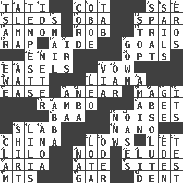 ACROSS 1. Jacques of French films 5. Small bed 8. Compass dir. 11. Bobsleighs 13. Chief or king in Benin or Nigeria 14. Coast Guard woman 15. ID or VA city 16. Director Reiner 17. Musical group of three 18. Hit sharply and swiftly 19. Assistant 21. Finish lines 22. Independent ruler or chieftain 24. Chooses 25. Artist's stands 27. Promise 29. Electrical Unit 30. Climbing, woody, usually tropical vines 32. Relaxation 33. Approach 35. Wise men 39. Role for Stallone 41. Collude with 42. Sound made by sheep 43. Annoying sounds 45. Broad, flat, thick piece 48. Billionth: prefix 49. Large country 50. Coldest temperatures 52. Allow 55. _ and Stitch 56. Lower and raise head in agreement 57. Dodge 59. Roberta Peters solo 60. Had dinner 61. Locates 62. Mountains (abbr.) 63. Slender fish 64. Gouge DOWN 1. Russian ruler of old 2. _ mater 3. Storms 4. Wedding promise 5. Drawstring 6. Mitch Miller's instrument 7. Keyboard key 8. Small fatty European fish 9. Travel by water 10. Greek god of love 12. Slow-paced one 14. Close up, plug up 20. Big collection agency 21. Bride's dress 23. Distance measurement 25. She-sheep 26. American Automobile Association (abbr.) 27. By way of 28. Rowing implement 30. Lion 31. At full speed 33. Housemaid (var.) 34. Basketball assoc. 36. Utter; complete 37. Turn to the right 38. It is 40. Swedish rock group 43. Compass dir. 44. Fertile tracts in a desert 45. Chest covering 46. Ms. Damita and namesakes 47. Small Philippine buffalo 49. Burrowing marine mollusk 50. Globular water bottle used in Asia 51. Baltic tributary 53. Locale of original sin 54. Trial 56. Tired old horse 58. Flaplike covering