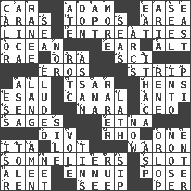 ACROSS 1. Automobile 4. First of billions? 8. Relaxation 12. Ancient river in northeast Turkey 14. Traditional theme or motif 16. Type of rug 17. Actor's bit 18. Pleas 20. Sea 22. Hearing organ 23. Keyboard modifier key 24. Actress Charlotte 25. Mouth or opening 28. _-fi 30. Greek god of love 31. Long narrow piece of something 35. Everything 37. Russian ruler of old 40. Coop moms 41. Son of Isaac 42. Lessep's creation 44. Opposed to 45. Post 46. Hindu Mythology: god of death 47. Corporate head (abbr.) 48. Gurus 50. Inactive volcano in Sicily 52. HTML Container Element 54. 17th letter of the Greek alphabet 55. Single 58. Call ___ day 61. Car dealer's back yard 63. Make _____ (do battle with) 65. Wine waiters 70. Narrow opening 71. Toward shelter 72. World-weariness 73. Airs 74. Monthly bill 75. Ooze 76. For each DOWN 1. Bodily heat indicating an inflammation 2. N. Chile seaport 3. The wife of a rajah (variant) 4. Had dinner 5. Spanish title 6. Fitting 7. Greater amount 8. Ingest 9. Roberta Peters solo 10. Stitch closed the eyes of (a falcon) 11. Compass direction 13. Ocean 15. Oceans 19. Curves 21. And not 26. College mil. group 27. Indian state 29. New York city 30. Dodged 32. French philosopher Descartes 33. To the inside or interior of 34. 23rd letter of the Greek alphabet 35. At sea 36. Long (Scottish) 38. Santa ___, CA 39. Less widely known 41. Double-curved letter 43. Thin strip of wood or metal 49. Drop; flow; fall 51. Immediately 53. Grand slam 55. Lowest deck of a ship 56. Trap for birds or small mammals 57. Keyboard key 58. Austrian river, tributary to the Danube 59. Lacquered or enameled metalware 60. So be it 62. Canisters 64. Cleo's killer 66. Was introduced to 67. Compass dir. 68. Regret 69. Small drink