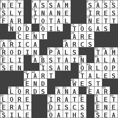ACROSS 1. Fish or hair follower 4. Indian state 9. Backtalk 13. Wily 14. Silly 15. Angers 16. At a great distance 17. Add up to 18. Remaining after all deductions 19. Allow head to fall sleepily 21. Lubricate 22. Ancient Roman robes 24. Penny 26. "We ___ not amused" (Victoria) 27. N. Chile seaport 29. Curves 30. "The Thinker" sculptor 31. Friends 33. Scottish cap 36. Connecticut Ivy Leaguer 37. Refrain by choice 40. Wing 41. Elected rep. 42. Austrian river, tributary to the Danube 43. Fourth or lowest deck 45. Small pie 47. Falsehoods 48. Conclusion 49. Compass direction 50. Nobles 52. Santa ___, CA 54. Ewer handle 56. Old wives' tales, e.g. 57. Feeling or showing extreme anger 59. Allow 61. Part of Q.E.F. 62. Plates 63. Compass dir. 64. Filth; sediment 65. Profane or obscene expressions 66. Ocean DOWN 1. Science/research agcy. 2. Flair 3. Polypeptide antibiotic 4. Small island 5. Snout, nose 6. Suttee (variant) 7. Of or related to the anus 8. Cartoonist voice _ Blanc 9. Scorches 10. Type of rug 11. Puts into a specified state 12. Fast jet (abbr.) 20. Tenth: prefix 22. Tarsus (plural) 23. The grampus (Milton) 25. Nanny 27. Ancient Greek god of war 28. Hero or heavy, e.g. 29. Having or resembling wings 31. Inconspicuous attention getter 32. _ moment's notice (2 wds.) 33. Baron Munchausen's specialties 34. _ vera 35. Atlas contents 38. Avian creatures 39. Brief written record 44. To erase 45. Cylindrical with tapered ends 46. Plus 49. Timepiece 50. Australian parrot (variant) 51. Taken by mouth 52. Roberta Peters solo 53. Political cartoonist Thomas 55. French philosopher Descartes 56. French article 57. Wedding promise 58. Double-curved letter 60. Beverage made from leaves