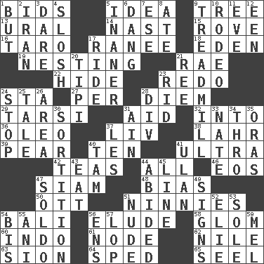 ACROSS 1. Auction offers 5. It may be bright or harebrained 9. Relationship diagram 13. Mountain range 14. Political cartoonist Thomas 15. Be footloose 16. Edible starchy tuberous root 17. Indian princess (variant) 18. Paradise 19. Snuggling 21. Actress Charlotte 22. Flintstone garb 23. Make new 24. R.R. building 27. For each 28. South Vietnam president (1954) 29. Tarsus (plural) 31. Assist 32. To the inside or interior of 36. Margarine 37. 54 in ancient Rome 38. Cowardly lion portrayer 39. Lightbulb-shaped fruit 40. Nine, plus one 41. Extremist 42. Beverages made from leaves 44. 100% 46. Greek goddess of the dawn 47. Thailand, formerly 48. Prejudice 50. Baseball player Mel 51. Fools 54. Indonesian resort city 56. Dodge 58. Take by theft 60. Southeast Asian peninsula 61. Thickened enlargement 62. "Death on the ____" 63. The Jewish people; Israel 64. Moved rapidly 65. Sew up the eyelids of hawks and falcons DOWN 1. With the exception that 2. SW Asia republic 3. Have the gumption 4. Splash clumsily 5. More empty; more void 6. Mild oath, euphamism for damn 7. Compass dir. 8. Had dinner 9. Excercise machine 10. Cowboy competition 11. Night before a holiday 12. Car or cant ending 17. Travel on an animal 20. Native american tent (variation) 21. Portuguese money of account (variant) 23. To free from 24. Halt 25. Falsehood 26. Length times width 28. HTML Container Element 30. Determination 31. The 18th letter of the Arabic alphabet 33. Nathan's nickname 34. Through, poetically 35. Mouths or openings 37. French article 40. Scottish cap 41. ____ Bator, Mongolia 43. Erode 44. Tolerated 45. Actor's bit 47. Twentieth part of a lira 49. Omens 51. Unadorned 52. Writer Wiesel 53. Not divided or shared with others 54. Again 55. Cuckoo 56. Followers of ems 57. Trim (branches) 59. Cartoonist voice _ Blanc