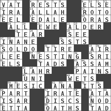 ACROSS 1. Large container 4. Musical pauses 9. Otherwise 13. Retirement account (abbr.) 14. Assad's deity 15. Printing process, for short 16. Snakelike fish 17. Peak District village in England 18. Mouths or openings 19. 100% 21. She-sheep 22. Tree or shrub in the Birch family 24. Rend 26. Perceive with the eye 27. Empty; void 29. Fast planes 30. Twentieth part of a lira 31. Hoop that covers a wheel 33. Atmosphere 36. Area sheltered from the wind 37. Inhabiting a nest 40. Indian title of respect (Mr.) 41. Raised railways 42. Bits 43. Indian state 45. Cowardly lion portrayer 47. Aches 48. Corn or form start 49. Moistens 50. Mesonic 52. Santa ___, CA 54. It is 56. Component 57. Feeling or showing extreme anger 59. _ moment's notice (2 wds.) 61. Austrian river, tributary to the Danube 62. Plates 63. Allow head to fall sleepily 64. Singer James 65. Expletives 66. Small boy DOWN 1. Compete 2. Type of rug 3. Baron Munchausen's specialties 4. Actress Charlotte 5. A person who is older than you are 6. Cole _ (cabbage dish) 7. Falsehood 8. A female animal or person 9. Eats (away) 10. Old wives' tales, e.g. 11. Play the lead 12. Greek goddess of the dawn 20. Grant temporary use of 22. NE Netherlands city 23. Allow 25. Age 27. Small island 28. Christmas carol 29. Indian titles of respect 31. Russian ruler of old 32. It would 33. Aide 34. SW Asia republic 35. Basketball hoops 38. Value system 39. Open wide 44. Suttee (variant) 45. A period of five years 46. Black tropical American cuckoo 49. Timepiece 50. Vertical spar for supporting sails 51. Part of Q.E.F. 52. Roberta Peters solo 53. Political cartoonist Thomas 55. Portico 56. Sliced dessert 57. Wedding promise 58. Curvy letter 60. Say or write further