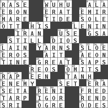 ACROSS 1. Raze (variant) 5. Chinese city south-southwest of Nanjing 9. In the manner of 12. Inky black, to poets 13. Part of Q.E.F. 14. Independent ruler or chieftain 15. Female horse 16. Event that recurs at intervals 17. Not divided or shared with others 18. Baseball player Mel 19. Part of HMS, perhaps 21. Soviet premier 1918-24 22. SW Asia republic 24. Purpose 26. Girls' org. (abbr.) 27. Free of sound 28. "Vaya con ____" 29. (Had) reclined 30. Tall tales 32. _ gin 36. Greek god of love 37. Small island 38. Age 39. Prong on a fork 40. Relatively large 42. Plant excrements 43. Vintage cars 44. Leaves out 46. Hit sharply and swiftly 49. Car or cant ending 50. Hyperbolic tangent 51. Foe 53. Arrange properly for use 54. Period 57. Bristle 58. Painter Guido (1575-1642) 61. Flintstone 62. Canvas cover 63. Composer Stravinsky 64. Tear apart 65. Indian title of respect (Mr.) 66. Legendary monster 67. Lyric poems DOWN 1. San ____ (Riviera town) 2. Blind as ____ 3. Making a chance decision by using lots 4. Compass dir. 5. Moistens 6. RI univ. 7. Possessed 8. Shoshoni 9. Amid 10. Ms. Damita and namesakes 11. Sports stadium 14. Compass dir. 19. Actor Linden 20. Inwardly 21. French article 23. Wash lightly 24. National forest in Provo, Utah 25. Mayday 27. Indian skirt 28. Frees from moisture 29. Allow 31. Composer Copland 32. Indian antelope 33. Tough but pliablecoriaceous 34. I made a mistake 35. Followers of ems 40. Unit of force equal to gravity 41. Carryall 43. Marina Del _, California 45. Floor protector 46. Musical pauses 47. Approach 48. _ dish (used to culture cells) 52. Atlas unit 53. Beget 55. French philosopher Descartes 56. Sums up 58. River (Sp.) 59. Ovum 60. And not 61. Away