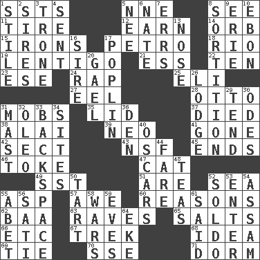ACROSS 1. Fast planes 5. Compass dir. 8. Observe 11. Hoop that covers a wheel 12. Merit 14. Globe 15. Metal shackles 17. Stone: prefix 18. River (Sp.) 19. Small, flat, pigmented spot on the skin 21. Double-curved letter 22. Nine, plus one 23. Compass dir. 24. Strike 25. Connecticut Ivy Leaguer 27. Snakelike fish 28. "Beetle Bailey" pooch 31. Crowds into 35. Flaplike covering 37. Passed on 38. Mountain range southwest of Kyrgyzstan 39. Modern: prefix 41. Went 42. Religious group 43. Overdraft (abbr.) 45. Conclusions 46. Casino tip 47. Domesticated feline 49. Fast jet (abbr.) 51. "We ___ not amused" (Victoria) 52. Ocean 55. Viper 57. Deep reverence 60. Thinks logically 62. Sound made by sheep 63. All-night dance parties 65. Table seasonings 66. And so on (abbr.) 67. Long journey 68. It may be bright or harebrained 69. Make a knot 70. Compass dir. 71. Dormintory (informal) DOWN 1. Vertical member of a panel or frame 2. Begets 3. Heavy duty weighing machine 4. Emitted 5. Born 6. Nathan's nickname 7. Blunders 8. Determination 9. One of the Great Lakes 10. Inky black, to poets 13. Characteristic smell of wine 16. Beget 17. Cotton for raincoats, e.g. 20. Highlander 26. Cabin 29. Be inclined (to) 30. Lyric poems 31. Vertical spar for supporting sails 32. Margarine 33. Keyboard key 34. Locates 36. Lair 40. Motion picture awards 44. Conductor's collection 48. Beverages made from leaves 50. Small pie 52. Twentieth part of a lira 53. Keyboard key 54. Indian state 55. Collude with 56. Suttee (variant) 58. Armed conflicts 59. Nights before holidays 61. Stated 64. Make supply last