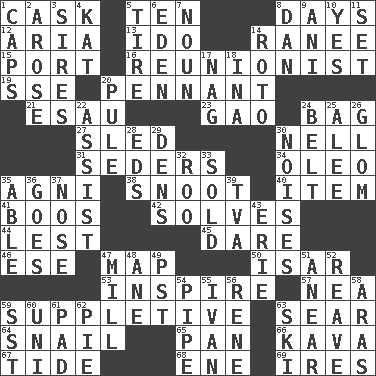 ACROSS 1. Keg 5. "___ Little Indians" 8. 24-hour periods 12. Operatic vocal solo 13. Wedding promise 14. The wife of a rajah (variant) 15. Left side of a ship or aircraft 16. One who advocates reunion 19. Compass dir. 20. Pre-World Series prize 21. He sold his birthright 23. E Mali city 24. Container for groceries 27. Downhill vehicle 30. 1994 drama film starring Jodie Foster 31. Spring feasts 34. Butter sub 35. Hindu god of fire 38. Snout, nose 40. A distinct part 41. Scornful sounds 42. Finds the solution 44. For fear that 45. Have the gumption 46. Compass dir. 47. Atlas unit 50. Austrian river, tributary to the Danube 53. Stimulate to action 57. Teachers' org. 59. Supplementary 63. Dry up 64. Slow-paced one 65. Baking dish 66. Polynesian shrub of the pepper family 67. Periodic rise and fall of the sea level 68. Compass dir. 69. Angers DOWN 1. Balmoral and tarboosh 2. Came up 3. Founders of families 4. Krazy ___ of comics 5. Hoop that covers a wheel 6. Genesis locale 7. Part of speech 8. Daniel's nick name 9. Black tropical American cuckoo 10. Consenting reply 11. Arrange properly for use 14. Printing process, for short 17. Tired old horse 18. _ tizzy (2 wds.) 20. Whine 22. Aid 24. Waist strap 25. Toward shelter 26. Take by theft 28. Begley and Asner 29. Habitations of wild animals 30. Annoying sounds 32. Friend of Pooh 33. Exchanged or delivered for money 35. Competent 36. Moves 37. Sense of smell 39. Federal power corp. 43. 4th largest of the Great Lakes 47. Place where flour is made 48. One (Scot) 49. Pacific Standard Time (abbr.) 51. Approach 52. Rob, plunder, or pillage 54. Corncob 55. "Terrible" tsar 56. French philosopher Descartes 58. Caspian sea tributary 59. Fast jet (abbr.) 60. Corn or form start 61. Groovy apt. 62. Sliced dessert 63. What Jean-Claude Killy likes to do