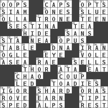 ACROSS 1. I made a mistake 5. Balmoral and tarboosh 9. Elects 13. Thailand, formerly 14. Washington bills 15. Turn sharply 16. Spanish pot 17. Marketplace scale 18. Adolescent 19. French poetic form 21. Beverage made from leaves 22. Flintstone garb 23. Without 24. R.R. building 27. Teachers' org. 28. Musical composition 29. Eating place 31. Heredity factor (abbr.) 32. SW Asia republic 36. Stare at amorously 37. Sight organ 38. Grand slam 39. At sea 40. Actress Charlotte 41. Makes a sale 42. Son of Odin 44. "One Day ___ Time" 46. Erode 47. US Secretary of Labor Elaine L. _ 48. Overturn; upset 50. Directed 51. Sycophants 54. Russian composer Stravinsky 56. Pottery fragment 58. Mouths or openings 60. Be footloose 61. Merit 62. Native american tent (variation) 63. Drove too fast 64. High mountains 65. Take ten DOWN 1. Bear (Spanish) 2. Petroleums 3. Diluted with white 4. Box-office sellout 5. Pupil covering 6. Small Philippine buffalo 7. Animal enclosure 8. Compass dir. 9. Clearly or manifestly demonstrative 10. Entreaties 11. Third day of the wk. 12. Elected rep. 17. Periodic rise and fall of the sea level 20. Prong on a fork 21. The 19th letter of the Greek alphabet 23. Health resort 24. Portico 25. Labels 26. Competent 28. Single 30. Tough but pliablecoriaceous 31. Color 33. Hero or heavy, e.g. 34. Silent film actress Nazimova 35. Egg locale 37. Ewer handle 40. Friend of Pooh 41. Saudi Arabian king (1953-1964) 43. Possessed 44. Oak nuts 45. Frog relative 47. Garlic unit 49. Peter (Polish) 51. Canvas cover 52. One of the Great Lakes 53. Plant excrements 54. Big collection agency 55. Grand Old Party 56. Ocean 57. Actor Linden 59. Be seated