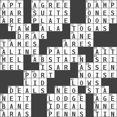 ACROSS 1. Fitting 4. Match 9. Moist 13. Spoil 14. Sets or collections 15. Singles 16. "We ___ not amused" (Victoria) 17. Food holder 18. Do not 19. The 23rd letter of the Hebrew alphabet 21. Insect wing 22. Ancient Roman robes 24. To be drawn or hauled along 26. One (Scot) 27. Makes less strong or intense 29. Ancient Greek god of war 30. Place in a line 31. Friends 33. Small island 36. Cartoonist voice _ Blanc 37. Refrain by choice 40. Indian title of respect (Mr.) 41. Snakelike fish 42. Austrian river, tributary to the Danube 43. NE Netherlands city 45. Left side of a ship or aircraft 47. Annoying sound 48. Hat (slang) 49. Moos 50. Allots cards 52. Modern: prefix 54. R.R. building 56. Remaining after all deductions 57. Cabin 59. Mature 61. Object of repulsion 62. Standard of perfection 63. Compass dir. 64. Caspian sea tributary 65. Actor Sean's family 66. Metal container DOWN 1. Housemaid (var.) 2. Piece 3. Excercise machine 4. Cleo's killer 5. POW camp 6. Monetary unit of Yemen 7. Singer James 8. Compass dir. 9. Evades 10. Small Philippine buffalo 11. Not women's 12. Pacific Standard Time (abbr.) 20. Songbird 22. Tarsus (plural) 23. Single 25. At sea 27. Not wild 28. Toward shelter 29. Having or resembling wings 31. Inconspicuous attention getter 32. "One Day ___ Time" 33. Helper 34. Angers 35. Prong on a fork 38. Avian creatures 39. Billionth: prefix 44. Sty mamas 45. Food holders 46. Petroleum 49. Utah city north of Ogden 50. Letter starter 51. Inactive volcano in Sicily 52. Thickened enlargement 53. Paradise 55. Hindu god of fire 56. Basketball assoc. 57. Mouth edge 58. Raised railways 60. Car or cant ending