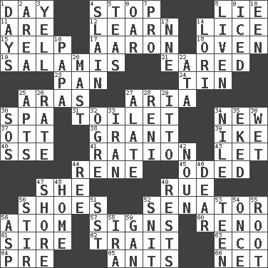 ACROSS 1. 24 hours 4. Halt 8. Falsehood 11. "We ___ not amused" (Victoria) 12. Memorize 14. Louse (plural) 15. Sharp bark 17. Composer Copland 18. Baking chamber 19. Deli grouping 21. Having ears or earlike features 23. Baking dish 24. Shallow baking pan 25. Ancient river in northeast Turkey 27. Roberta Peters solo 30. Health resort 31. Rest room 34. ___ Haven, CT 37. Baseball player Mel 38. Let have 39. Mamie's mate 40. Compass dir. 41. Food allowance for one day 43. Allow 44. French philosopher Descartes 45. Wrote a lyric poem 47. A female animal or person 49. Sorrow 50. Imelda's hoard 52. Elected representative 56. Tiny particle 57. Signals 60. Western Nevada city 61. Father 62. Distinguishing feature 63. Environmental prefix 64. Before (prefix) 65. Pismires 66. Fish or hair follower DOWN 1. 24-hour periods 2. Type of rug 3. Shout 4. Killed 5. Afternoon social gatherings 6. Boat paddle 7. Adept person 8. Make or become more lively 9. On the rocks 10. Car or cant ending 13. Compass dir. 14. Australian parrot (variant) 16. Dad 20. Vertical spar for supporting sails 22. "One Day ___ Time" 25. Tenement units (abbr.) 26. Assign a rank or rating to 27. Having winglike extensions 28. Painter Guido (1575-1642) 29. "Tell ____ the Marines!" 30. Distress signal 32. Legendary monster 33. SW Asia republic 34. "Death on the ____" 35. Made supply last 36. Soggy 42. Part of speech 44. Portuguese money of account (variant) 46. Letter starter 47. Dinah or Pauly 48. Residence 49. Musical pauses 50. Tumult 51. Fast jet (abbr.) 52. In a ____ (agitated or irritated) 53. Adolescent 54. Single time 55. Carrot, for example 56. Cleo's killer 58. Retirement account (abbr.) 59. Separate the seeds from cotton