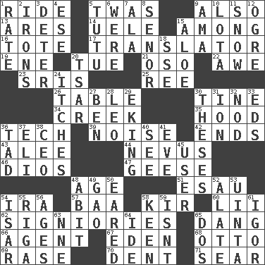 ACROSS 1. Travel on or in a vehicle 5. It was, poetically 9. In addition 13. Ancient Greek god of war 14. Ubangi River tributary 15. Amid 16. Lug 17. Interpreter 19. Compass dir. 20. Third day of the wk. 21. Bear (Spanish) 22. Deep reverence 23. Indian titles of respect 25. To separate or throw off 26. Eating place 30. Prong on a fork 34. Small stream 35. Parka part 36. Technical 39. Annoying sound 42. Conclusions 43. Toward shelter 44. Congenital growth or mark on the skin 46. "Vaya con ____" 47. Honkers 48. Mature 51. He sold his birthright 54. Lyricist Gershwin 57. Sound made by sheep 58. Apertif with cassis 60. Cards in a Roman deck? 62. Seigniories (variant) 65. Mild oath, euphamism for damn 66. Representative 67. Locale of original sin 68. Von Bismarck 69. Raze (variant) 70. Incision 71. Singe DOWN 1. Assign a rank or rating to 2. Metal shackles 3. Prevent from occurring 4. Compass dir. 5. Ballerina skirt 6. Past tense of be (plural) 7. According to 8. Sir (Sp.) 9. Nanny (var.) 10. Globular water bottle used in Asia 11. Frozen precipitation 12. Legendary monster 15. _ vera 18. Compass dir. 20. Russian ruler of old 24. Strong, restless desires 27. Benjamin's nick name 28. Lion 29. Supplementing with great effort 30. College papers 31. Electrically charged atom 32. Dreamland 33. Begley and Asner 36. Bit 37. Biblical high priest 38. Corporate head (abbr.) 40. Observe 41. First lady 45. One who makes use of a thing 48. "This won't hurt ____!" 49. E Mali city 50. Having ears or earlike features 52. Having winglike extensions 53. National forest in Provo, Utah 54. Austrian river, tributary to the Danube 55. Port city in Latvia 56. Eras 58. Peachy ____! 59. Is not 61. Composer Stravinsky 63. Compass dir. 64. Binary compound 65. Two (Sp.)