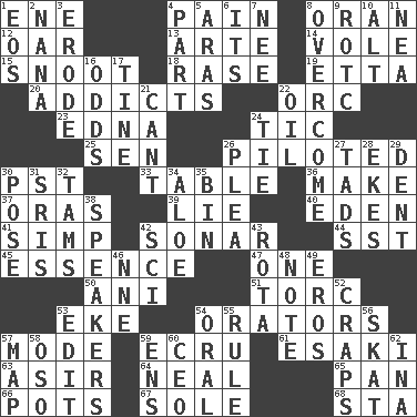 ACROSS 1. Compass dir. 4. Ache 8. NW Algerian seaport 12. Boat paddle 13. Johnson of "Laugh-In" 14. Grand slam 15. Snout, nose 18. Raze (variant) 19. Singer James 20. Inveterate users 22. The grampus (Milton) 23. Pulitzer Prize-winning author Ferber 24. Nervous spasm 25. Elected rep. 26. Manned the helm 30. Pacific Standard Time (abbr.) 33. Eating place 36. Cause to be 37. Mouths or openings 39. Falsehood 40. Paradise 41. Simple or foolish person 42. Underwater navigation system 44. Fast jet (abbr.) 45. Gist 47. Single 50. Cuckoo 51. Torque (variant) 53. Supplement with great effort 54. Speakers 57. Method 59. Shade of tan 61. 1973 Nobel Price Winner (Physics) Leo 63. SW Saudi Arabia district 64. Actress Patricia 65. Baking dish 66. Plant holders 67. Flatfish 68. R.R. building DOWN 1. Greek goddess of the dawn 2. Nanny 3. Wear away 4. Component 5. Caspian sea tributary 6. ___ a Wonderful Life 7. Born 8. Conquer 9. College mil. group 10. Keyboard modifier key 11. Teachers' org. 16. Likelihood 17. Prong on a fork 21. Patter 22. Petroleum 24. Make a knot 26. Entreaty 27. Small amounts or degrees 28. Makes supply last 29. Scratch 30. Airs 31. Indian titles of respect 32. Scottish caps 34. _ vera 35. Storage container 38. Orators 42. _-fi 43. Round or rotation of duties 46. Compass dir. 48. Short letter 49. Greek god of love 52. Dice game 53. Prepare for publication 54. Taken by mouth 55. Court order 56. Three-handed card game 57. Atlas unit 58. Bear (Spanish) 59. Followers of ems 60. Corporate head (abbr.) 62. _ tizzy (2 wds.)