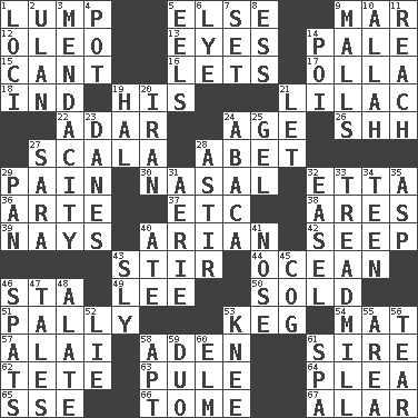 ACROSS 1. Mass 5. Otherwise 9. Impair 12. Butter sub 13. Snake ____ (dice throw) 14. Diluted with white 15. Patter 16. Allows 17. Spanish pot 18. Indiana (abbr.) 19. Part of HMS, perhaps 21. Pale purple color 22. The sixth month of the Jewish calendar 24. Ripen 26. Quiet! 27. Any of the three canals of the cochlea 28. Collude with 29. Ache 30. Rhinal 32. Singer James 36. Johnson of "Laugh-In" 37. And so on (abbr.) 38. Ancient Greek god of war 39. Negative votes 40. Believer in; advocate of (suffix) 42. Ooze 43. Agitate 44. Sea 46. R.R. building 49. Area sheltered from the wind 50. Exchanged or delivered for money 51. Chummy 53. Barrel 54. Floor protector 57. Mountain range southwest of Kyrgyzstan 58. An important port of Yemen 61. Father 62. False hair 63. Whimper 64. Entreaty 65. Compass dir. 66. Heavy book 67. Having or resembling wings DOWN 1. Event scenes 2. ____ Bator 3. Ananias' fault 4. Cooking vessel 5. Snakelike fish 6. Potassium hydroxide 7. Arrange properly for use 8. Double-curved letter 9. Shopping centers 10. Assad's deity 11. Arrive at 14. Luau course 19. Actor Linden 20. SW Asia republic 21. Allow 23. Natives or inhabitants of Denmark 24. Phillipine bananalike plant 25. Set 27. "Two Mules for Sister ____" 28. Moving about 29. Baking dish 31. Nest on high 32. Artist's stand 33. Excercise machine 34. Adolescent 35. Viper 40. Had dinner 41. Sense of smell 43. Wily 45. Gear tooth 46. Arguments over trivial matters 47. Stories 48. Having winglike extensions 52. Falsehood 53. Leg joint 55. Type of rug 56. Pull into pieces 58. Fitting 59. Superhero pair 60. Shade tree 61. Health resort