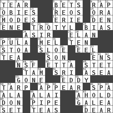 ACROSS 1. Separate forcefully 5. Antes 9. Strike 12. Off-Broadway awards 14. Vintage cars 15. Mouth or opening 16. Methods 17. 4th largest of the Great Lakes 18. Lair 19. Compass dir. 20. Trinitrotoluene 23. Prejudice 24. SW Saudi Arabia district 25. Liveliness 27. Monetary unit of Botswana 30. Cartoonist voice _ Blanc 32. Nine, plus one 33. Portico 34. _ gin 36. Snakelike fish 38. Beverage made from leaves 39. Male offspring 40. Followers of ems 43. Science/research agcy. 46. Singer James 48. Proofreading order 49. Scottish cap 51. _ Lanka 52. Toward the sea 53. Went 54. Whirlpool 56. Canvas cover 58. Become visible 61. Health resort 64. Chicken ___ king 65. Jai ____ 66. Hold, grip (Informal) 68. Spanish title 69. Corncob 70. An organ shaped like a helmet 71. Arrange properly for use 72. Beverages made from leaves 73. Letter starter DOWN 1. Heavy book 2. Inky black, to poets 3. Assistant 4. To sift 5. Cy Young winner Saberhagen 6. Suggestive of the supernatural 7. Bathroom 8. Compass dir. 9. "The Thinker" sculptor 10. Type of rug 11. Baking dishes 13. Fast planes 21. Basketball hoops 22. Threatening words 23. Object of repulsion 24. American Automobile Association (abbr.) 26. Area sheltered from the wind 27. Pacific Standard Time (abbr.) 28. Shoshoni 29. Grant temporary use of 31. Plunders 35. Main course 37. Allows 41. Born 42. R.R. building 44. Constrict 45. Air blower 47. Opera by Verdi 48. Declare 50. Ear of corn 53. Monetary aid 55. To trail on the ground 56. Bits 57. _ vera 59. Dad 60. Sliced desserts 61. Flatfish 62. Entreaty 63. The sixth month of the Jewish calendar 65. Fitting 67. Possessed