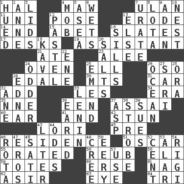 ACROSS 1. Actor Linden 4. Informal term for the mouth 7. ____ Bator 11. Single; one (prefix) 12. Introduce or present, as a question 13. Wear away 14. Conclude 15. Collude with 16. Chalkboards 17. Writing tables 19. Aide 21. Had dinner 23. Toward shelter 24. Baking chamber 25. Pipe bend 26. Bear (Spanish) 29. Peak District village in England 30. Mountains (abbr.) 31. 4-wheeled motor vehicle 32. Find the sum of 33. French article 34. Period 35. Compass dir. 36. Car or cant ending 37. Slender Brazilian palm 40. Hearing organ 41. Also 42. Make senseless or dizzy 43. Australian parrot (variant) 45. Before (prefix) 46. Home 51. Witty Wilde 55. Spoke pompously 56. Reuben's nickname 58. Biblical high priest 59. Lugs 60. Celtic language 61. Tired old horse 62. SW Saudi Arabia district 63. Sight organ 64. Three (prefix) DOWN 1. Became colored 2. Singer Murray 3. Hats (slang) 4. Disorderly crowd 5. Toward the sea 6. Moistens 7. A salt of uric acid 8. Globular water bottle used in Asia 9. An important port of Yemen 10. A home for chicks 12. Soft color 13. Otherwise 16. Beverly of Met fame 18. Polynesian shrub of the pepper family 20. Table seasonings 22. Compass dir. 24. More peculiar 25. Make improvements or corrections to 26. Sea 27. Indian skirt 28. Mouth or opening 29. Pulitzer Prize-winning author Ferber 32. One (Scot) 33. Soviet premier 1918-24 36. Having ears or earlike features 37. Viper 38. Disco prop 39. Institutes legal proceedings 43. 61 cubic inches 44. Lyric poems 46. Round or rotation of duties 47. Greek god of love 48. Suttee (variant) 49. Algonquian 50. Suggestive of the supernatural 52. Penny 53. Having or resembling wings 54. Swiss mountan, "Queen of the Mountains" 57. Purpose