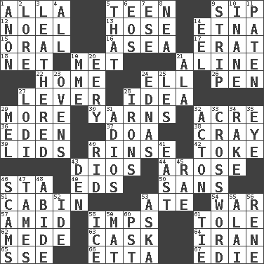 ACROSS 1. Silent film actress Nazimova 5. Adolescent 9. Small drink 12. Christmas carol 13. Stockings 14. Inactive volcano in Sicily 15. Relating to the mouth 16. Toward the sea 17. Part of Q.E.F. 18. Fish or hair follower 19. Was introduced to 21. Place in a line 22. Dwelling 24. Pipe bend 26. Fenced enclosure 27. Prying instrument 28. The content of cognition 29. Greater amount 30. Entertaining tales 32. Measure of real estate 36. Locale of original sin 37. ___ good deed 38. Supercomputer manufacturer 39. Hats (slang) 40. Remove soap 42. Casino tip 43. "Vaya con ____" 44. Came up 46. R.R. building 49. Begley and Asner 50. Without 51. Apartment or room in a ship 53. Had dinner 54. Armed conflict 57. Among 58. Naughty children 61. Lacquered or enameled metalware 62. Ancient Persian 63. Keg 64. SW Asia republic 65. Compass dir. 66. Singer James 67. Singer Brickell DOWN 1. Soon (poet.) 2. Old wives' tales, e.g. 3. Resembling or made to resemble leather 4. 100% 5. Not this but _ 6. Greek goddess of the dawn 7. Compass dir. 8. Teachers' org. 9. Empty completely 10. Lacking in sense or substance 11. Eucharist need 14. Snakelike fish 19. Madame (abbr.) 20. Suggestive of the supernatural 21. Wing 23. Baking chambers 24. Ferber et al. 25. French article 27. Farming town in central California 28. Removes the wrinkles 29. Cartoonist voice _ Blanc 31. Goodbye (Sp.) 32. Gambison 33. What you're doing now 34. Libertine 35. Sight organ 40. To free from 41. 90 degrees 43. Lair 45. Actress Charlotte 46. Fraudulent business schemes 47. Domesticates 48. Tolerate 52. Binary compound 53. "____ silly question..." 55. Jai ____ 56. French philosopher Descartes 58. Frozen water 59. Floor protector 60. Pacific Standard Time (abbr.) 61. Standoff