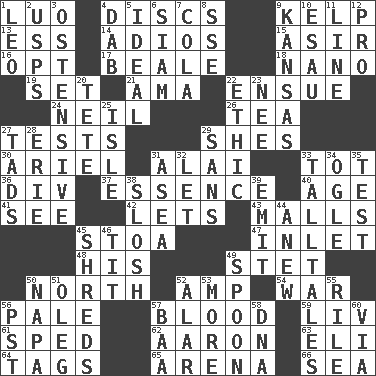 ACROSS 1. Nilotic language 4. Plates 9. Seaweed 13. Double-curved letter 14. Goodbye (Sp.) 15. SW Saudi Arabia district 16. Elect 17. Memphis, Tenn. Street 18. Billionth: prefix 19. Arrange properly for use 21. Wet nurse (var.) 22. Follow as a consequence or result 24. Famous astronaut Armstrong 26. Afternoon social gathering 27. Trials 29. "______ My Girl" (Turtles hit) 30. Satellite of Uranus 31. Jai _ 33. Small child 36. HTML Container Element 37. Substance 40. Mature 41. Observe 42. Allows 43. Shopping centers 45. Portico 47. An arm off of a larger body of water 48. Part of HMS, perhaps 49. Proofreading order 50. Compass direction 52. Electrical Unit 54. Armed conflict 56. Diluted with white 57. Vital fluid 59. 54 in ancient Rome 61. Broke a traffic law 62. Composer Copland 63. Connecticut Ivy Leaguer 64. Labels 65. Sports stadium 66. Ocean DOWN 1. Lion 2. United States Postal Service (abbr.) 3. Clearly or manifestly demonstrative 4. Small moist lump or mass 5. Perfect 6. Thailand, formerly 7. Root beer relative 8. Compass dir. 9. Sunflower state 10. Son of Isaac 11. Actor's bit 12. Adept person 20. False hair 22. Value system 23. Born 25. Small island 27. Small amounts or degrees 28. One of the Great Lakes 29. Without 31. Toward the sea 32. Allow 33. Baron Munchausen's specialties 34. Stare 35. Trial 38. Make a splashing sound 39. Send forth 44. Afresh 45. Tears up 46. Teat (slang) 49. Soup utensil 50. California wine valley 51. Cassini of fashion 52. Having or resembling wings 53. Greater amount 55. Cause heat under the collar 56. Pacific Standard Time (abbr.) 57. Sound made by sheep 58. Heredity factor (abbr.) 60. By way of