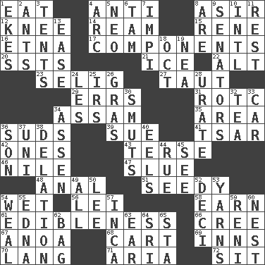ACROSS 1. Ingest 4. Opposed to 8. SW Saudi Arabia district 12. Leg joint 14. 480, 500 or 516 sheets of paper 15. French philosopher Descartes 16. Inactive volcano in Sicily 17. Pieces 20. Fast planes 21. Frozen water 22. The first octave above the treble staff 23. Major League Baseball Commissioner Bud 27. Tense 29. Blunders 31. College mil. group 34. Indian state 35. Length times width 36. Soap bubbles 39. Take to court 41. Russian ruler of old 42. Singles 43. Laconic 46. The longest river in the world 47. Turn sharply 48. Of or related to the anus 51. Full of seeds 54. Soggy 56. Luau accessory 58. Merit 61. The property of being fit to eat 66. Algonquian 67. Small Philippine buffalo 68. Heavy open wagon 69. Lodging establishments 70. Austrian-born American filmmaker Fritz 71. Roberta Peters solo 72. Be seated DOWN 1. Supplements with great effort 2. Pismires 3. Portable shelters 4. Curve 5. Modern: prefix 6. Scottish cap 7. Body of Kaffir warriors 8. "We ___ not amused" (Victoria) 9. Legislators 10. International (abbr.) 11. Take ten 13. Relaxation 18. Sep. follower 19. Teachers' org. 24. French article 25. Big collection agency 26. Pate de foie ____ 28. A salt of uric acid 30. Particles of soot 32. Afternoon social gathering 33. Auto 34. NE Netherlands city 36. Manchild 37. University (slang) 38. Conveyance 40. Snakelike fish 44. Sorrow 45. Perceive with the eye 49. 100% 50. Area sheltered from the wind 52. Tenth: prefix 53. Tall tales 54. Welt 55. Pulitzer Prize-winning author Ferber 57. South American Indian 59. Painter Guido (1575-1642) 60. Egg locale 62. Container for groceries 63. Hearing organ 64. Indian title of respect (Mr.) 65. R.R. building