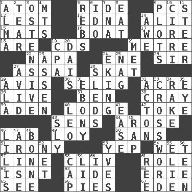 ACROSS 1. Smallest unit of an element 5. Travel on an animal 9. Personal Computers (abbr.) 12. For fear that 13. Pulitzer Prize-winning author Ferber 14. Came down and settled, as after flight 15. Floor coverings 16. Water vessel 17. Had on 18. "We ___ not amused" (Victoria) 19. Music discs 21. Distance measurement (Brit.) 22. California wine valley 24. Compass dir. 26. Title for a knight 27. Slender Brazilian palm 28. Three-handed card game 29. Deliberation 30. Major League Baseball Commissioner Bud 32. 1/640 square mile 36. Moving, as bait 37. Benjamin's nick name 38. Supercomputer manufacturer 39. An important port of Yemen 40. Inn 42. Casino tip 43. Elected reps. 44. Came up 46. Experiment locale 49. Myrna of the movies 50. Without 51. Literary sarcasm 53. Slangy assent 54. Dripping 57. Actor's bit 58. 154 in Roman numerals 61. Hero or heavy, e.g. 62. Is not 63. Assistant 64. One of the Great Lakes 65. Perceive with the eye 66. Sliced desserts 67. Locale of original sin DOWN 1. _ mater 2. Pull into pieces 3. Clearly or manifestly demonstrative 4. Mountains (abbr.) 5. Confederate soldiers (slang) 6. Wedding promise 7. Heredity factor (abbr.) 8. Erode 9. Schemes 10. High-altitude cloud 11. Bull 14. Deep reverence 19. Accounting whiz (abbr.) 20. Raised platform 21. Was introduced to 23. NE Netherlands city 24. Supplementing with great effort 25. Tired old horse 27. Enthusiastic 28. Bobsleighs 29. Insect wing 31. Dark wood 32. Gambison 33. What you're doing now 34. Immoral or dissolute person 35. Sight organ 40. Lion 41. Relaxation 43. Cunning 45. Hit sharply and swiftly 46. Ms. Damita and namesakes 47. Originate 48. Maid-servant 52. Fish or hair follower 53. Jacques Cousteau's middle name 55. Writer Wiesel 56. Adolescent 58. Head covering 59. Cards in a Roman deck? 60. Binary compound 61. To separate or throw off
