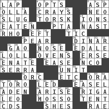 ACROSS 1. Pet locale 4. Chooses 8. Viper 11. Rounded earthenware pot or jar 13. Trading vessels 15. Modern: prefix 16. Snaillike creature with no shell 17. Cod relative 18. Charged particles 19. Eroded 21. Parent Teacher Assoc. 22. Political cartoonist Thomas 23. 17th letter of the Greek alphabet 24. Lizard (obsolete) 27. Nervous spasm 29. Lightbulb-shaped fruit 30. Middle Eastern gold or silver currency 34. E Mali city 36. Olfactory organ 39. Peak District village in England 40. Hang loosely or laxly 41. Baking chambers 43. Celtic language 44. Maternal 46. Relaxation 47. Non-commissioned officer (abbr.) 48. Father Junipero _ 49. A single undivided whole 51. The grampus (Milton) 53. And so on (abbr.) 54. Mouth or opening 57. "Corrida" creature 60. Directed 63. Artist's stand 65. Arabian gulf 66. Ascend 69. Capital of Latvia 70. Lion 71. With motion or animation 72. Portable shelter 73. Music discs 74. "______ My Girl" (Turtles hit) 75. Actress Charlotte DOWN 1. Failure 2. Assad's deity 3. Greek god of the underworld 4. Sep. follower 5. Adept person 6. Canvas cover 7. System (abbr.) 8. Small Philippine buffalo 9. Elected reps. 10. Mail 12. Grow older 14. Three-handed card game 18. Happening 20. Born 25. Papal veil 26. Collection of objects 28. Binary compound 29. Coward 31. Drug cop 32. In addition 33. To sift 34. Went 35. Having or resembling wings 37. Ocean 38. Take place subsequently 40. French article 42. Transmitted 45. Ewer handle 50. Frozen water 52. Burrowing marine mollusk 54. Flexible twig of a willow tree 55. Rain (Swedish) 56. Having winglike extensions 57. Baby powder 58. Wrote a lyric poem 59. Vintage cars 61. Greek god of love 62. Food container 64. Tate display 67. Compass dir. 68. Greek goddess of the dawn