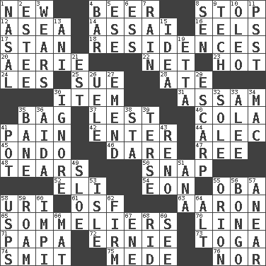 ACROSS 1. ___ Haven, CT 4. Fermented drink made from hops 8. Cease 12. At sea 14. Slender Brazilian palm 16. Snakelike fish 17. Comedian Laurel of Laurel & Hardy 18. Dwellings 20. Nest on high 22. Fish or hair follower 23. Being at a high temperature 24. French article 25. Take to court 28. Had dinner 30. A whole individual unit 31. Indian state 35. Container for groceries 37. For fear that 40. Root beer relative 41. Ache 42. Keyboard key 44. Actor Baldwin 45. Southwest Nigerian state 46. Have the gumption 47. To separate or throw off 48. Separates forcefully 50. Fastener 52. Biblical high priest 54. A really long time 55. Chief or king in Benin or Nigeria 58. RI univ. 61. Order of Saint Francis (abbr.) 63. Composer Copland 65. Wine waiters 70. Actor's bit 71. Dad 72. Bert's buddy 73. Ancient Roman robe 74. Stricken, poetically 75. Ancient Persian 76. And not DOWN 1. Relating to the nose 2. First name in cosmetics 3. Erodes 4. Soap unit 5. Compass dir. 6. Double-curved letter 7. Precipitation 8. Elected rep. 9. Technician 10. Butter sub 11. Inconspicuous attention getter 13. Cuckoo 15. It may be bright or harebrained 19. Singer James 21. Eastern Standard Time (abbr.) 26. Ubangi River tributary 27. Make improvements or corrections to 29. Fortification 30. Dismiss 32. Flatfish 33. Toward shelter 34. Apple computer (short form) 35. Object of repulsion 36. Opera by Verdi 38. R.R. building 39. Laconic 41. Plant holder 43. Western Nevada city 49. A type of plum 51. Santa ___, CA 53. Capri or Wright 55. Greek mythologigal hunter 56. Beat drum 57. Approach 58. United States Postal Service (abbr.) 59. Wander 60. Body of Kaffir warriors 62. Become taut 64. The first octave above the treble staff 66. Floor covering 67. Compass dir. 68. To free from 69. Observe