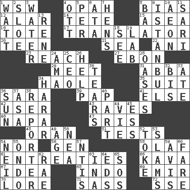 ACROSS 1. Compass dir. 4. Brightly colored fish 8. Prejudice 12. Having or resembling wings 14. Wig 15. At sea 16. Lug 17. Interpreter 20. Adolescent 21. Ocean 22. Black tropical American cuckoo 23. Arrive at 27. Inky black, to poets 29. Confront 31. Swedish rock group 34. White Person, in Hawaii 35. Set of matching outer garments 36. "Two Mules for Sister ____" 39. Infant food 41. Otherwise 42. One who makes use of a thing 43. All-night dance parties 46. California wine valley 47. Indian titles of respect 48. NW Algerian seaport 51. Trials 54. Not either 56. Commissioned mil. rank 58. Norwegian king 61. Pleas 66. Polynesian shrub of the pepper family 67. The main thing one is thinking about 68. _ china 69. Arab leader 70. Old wives' tales, e.g. 71. Backtalk 72. Compass dir. DOWN 1. Electrical Unit 2. A type of plum 3. Wetness 4. Baseball player Mel 5. For each 6. _ moment's notice (2 wds.) 7. Coop moms 8. Sound made by sheep 9. Byzantium, centuries later 10. Age 11. Indian skirt 13. French philosopher Descartes 18. Perceive with the eye 19. Experiment locale 24. Housemaid (var.) 25. Corporate head (abbr.) 26. Aid 28. Fertile tracts in a desert 30. Pulls apart 32. Altar cloth linen 33. Had dinner 34. Ethiopian city, capital of Harari 36. Player for Phoenix 37. White ___ sheet 38. Newsperson 40. Role in a play 44. Compete 45. Double-curved letter 49. Personal question 50. Teachers' org. 52. Casino tip 53. Shuts with force 54. Famous astronaut Armstrong 55. Southwest Nigerian state 57. Nuclear Threat Initiatives 59. Deliberation 60. Conductor's collection 62. Actress Charlotte 63. _ tizzy (2 wds.) 64. Begley and Asner 65. Distress signal