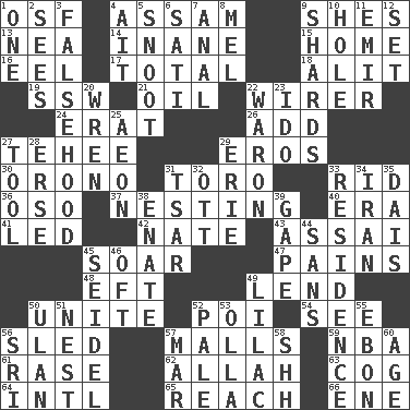 ACROSS 1. Order of Saint Francis (abbr.) 4. Indian state 9. "______ My Girl" (Turtles hit) 13. Teachers' org. 14. Lacking in sense or substance 15. Dwelling 16. Snakelike fish 17. "_____ Recall" 18. Set down 19. Compass dir. 21. Petroleum 22. One who wires 24. Part of Q.E.F. 26. Say or write further 27. Giggle 29. Greek god of love 30. U. of Maine site 31. "Corrida" creature 33. To free from 36. Bear (Spanish) 37. Nestling 40. Period 41. Directed 42. Nathan's nickname 43. Slender Brazilian palm 45. Fly high 47. Aches 48. Newt 49. Grant temporary use of 50. Join together 52. Luau course 54. Perceive with the eye 56. Downhill vehicle 57. Shopping centers 59. Basketball assoc. 61. Raze (variant) 62. Assad's deity 63. Gear tooth 64. International (abbr.) 65. Arrive at 66. Compass dir. DOWN 1. Single 2. Observes 3. It jiggles the polygraph 4. Small island 5. Snout, nose 6. Suttee (variant) 7. Of or related to the anus 8. Cartoonist voice _ Blanc 9. Broken pieces 10. Hollow 11. Independent ruler or chieftain 12. Put into a specified state 20. Songbird 22. Make _____ (do battle with) 23. Wedding promise 25. A really long time 27. Instrument 28. Celtic language 29. 4th largest of the Great Lakes 31. Russian ruler of old 32. Baseball player Mel 33. Dwelling 34. SW Asia republic 35. Raised platform 38. Maternal 39. Yawn 44. Without 45. Beer mug 46. Often (poetically) 49. Pale purple color 50. ____ Bator 51. Egg locale 52. Light colored 53. Spanish pot 55. Inky black, to poets 56. Indian title of respect (Mr.) 57. Spoil 58. Quiet! 60. Ripen