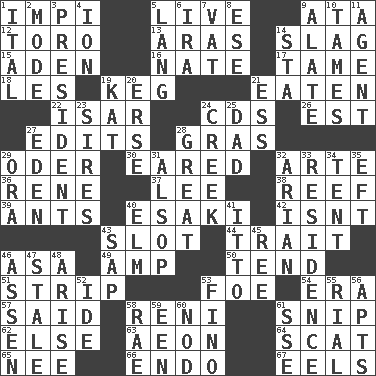 ACROSS 1. Body of Kaffir warriors 5. Not recorded 9. _ moment's notice (2 wds.) 12. "Corrida" creature 13. Caspian sea tributary 14. Volcanic refuse 15. Arabian gulf 16. Nathan's nickname 17. Not wild 18. French article 19. Cask 21. Eroded 22. Austrian river, tributary to the Danube 24. Music discs 26. Eastern Standard Time (abbr.) 27. Proofreads 28. Pate de foie ____ 29. Baltic tributary 30. Having ears or earlike features 32. Johnson of "Laugh-In" 36. French philosopher Descartes 37. Area sheltered from the wind 38. Coral collection 39. Pismires 40. 1973 Nobel Price Winner (Physics) Leo 42. Is not 43. Notch 44. Distinguishing feature 46. White ___ sheet 49. Electrical Unit 50. Be inclined (to) 51. Long narrow piece of something 53. Enemy 54. Epoch 57. Stated 58. Painter Guido (1575-1642) 61. Sever or remove by pinching or nipping 62. Otherwise 63. A really long time 64. Leave at once 65. Born 66. Inside; within (prefix) 67. Snakelike fish DOWN 1. Slanted text style (abbr.) 2. Method 3. Elected leader of a country 4. Electrically charged atom 5. Austrian-born American filmmaker Fritz 6. Retirement account (abbr.) 7. Large container 8. Compass dir. 9. Having winglike extensions 10. Softens 11. Representative 14. R.R. building 19. Krazy ___ of comics 20. Celtic language 21. Curvy letter 23. Male parents of animals 24. Small stream 25. June honoree 27. Paradise 28. Relatively large 29. Mouth or opening 31. Columnist Joseph or Stewart 32. Believer in; advocate of (suffix) 33. Dwelling 34. Portable shelter 35. Newt 40. Shade tree 41. "Tell ____ the Marines!" 43. Plant excrement 45. To riddle 46. NE Netherlands city 47. Having lost freshness 48. Get up 52. Binary compound 53. A pale, very dry sherry 55. Monetary unit of Yemen 56. Tenement units (abbr.) 58. Actress Charlotte 59. Car or cant ending 60. Dreamland 61. Compass dir.