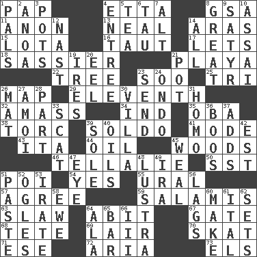 ACROSS 1. Infant food 4. Singer James 8. Girls' org. (abbr.) 11. At once, immediately (arch.) 13. Be tempered by heat 14. Ancient river in northeast Turkey 15. Globular water bottle used in Asia 16. Strained 17. Allows 18. More lively and spirited 21. Beach, in Buenos Aires 22. Relationship diagram 23. "Barney Miller" actor Jack 25. Three (prefix) 26. Atlas unit 29. Veterans Day date 32. Collect or gather 34. Working for oneself (abbr.) 35. Chief or king in Benin or Nigeria 38. Torque (variant) 39. Twentieth part of a lira 41. Method 43. Call ___ day 44. Petroleum 45. Forest 46. Copy Pinocchio 50. Fast jet (abbr.) 51. Luau course 54. It is so 55. Mountain range 57. Match 59. Deli grouping 63. Cole _ (cabbage dish) 64. "This won't hurt ____!" 67. Yard entry 68. False hair 69. Den 70. Three-handed card game 71. Compass dir. 72. Roberta Peters solo 73. Raised railways DOWN 1. Friends 2. Small Philippine buffalo 3. Cooking vessels 4. Main course 5. Afternoon social gathering 6. The 19th letter of the Greek alphabet 7. The first octave above the treble staff 8. Relatively large 9. Letch 10. Slender Brazilian palm 12. Political cartoonist Thomas 14. 100% 19. Angers 20. Snakelike fish 21. Plant holder 23. Post 24. Southwest Nigerian state 26. Floor protector 27. Mine, in Marseilles 28. Role in a play 30. Country estate 31. Same (prefix) 33. Go away! 36. Expressions of contempt or scorn 37. Sums up 39. Flatfish 40. Lubricates 42. Eastern Standard Time (abbr.) 45. Welt 47. Sight organ 48. A period of five years 49. Retirement account (abbr.) 51. Thick mixture 52. Stares at amorously 53. Feeling or showing extreme anger 56. Fails to keep up a pace 58. She-sheep 60. Cause to be 61. Slanted text style (abbr.) 62. Puts into a specified state 64. According to 65. Long, evenly shaped piece 66. One more than two