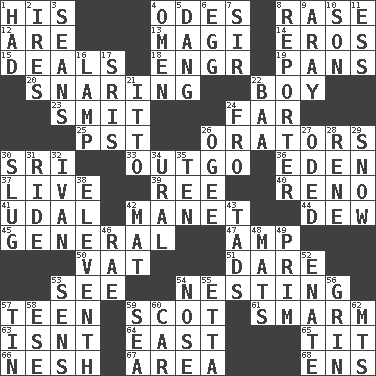 ACROSS 1. Part of HMS, perhaps 4. Lyric poems 8. Raze (variant) 12. "We ___ not amused" (Victoria) 13. Wise men 14. Greek god of love 15. Allots cards 18. Engineer (abbr.) 19. Baking dishes 20. Catching in a trap 22. Male child 23. Stricken, poetically 24. Distant 25. Pacific Standard Time (abbr.) 26. Speakers 30. Indian title of respect (Mr.) 33. Money paid out 36. Paradise 37. Not recorded 39. To riddle 40. Former U.S. Attorney General Janet 41. Allodial 42. French painter Edouard 44. Morning condensation 45. Commissioned military rank 47. Electrical Unit 50. Large container 51. Have the gumption 53. Observe 54. Snuggling 57. Adolescent 59. Highlander 61. Excessive but superficial compliments 63. Is not 64. Compass direction 65. Teat (slang) 66. Soft 67. Length times width 68. Followers of ems DOWN 1. Possessed 2. Angers 3. Seines 4. Sign of something about to happen 5. Mild oath, euphamism for damn 6. Oval reproductive body of a fowl 7. Title for a knight 8. Newsperson 9. Like ___ of sunshine 10. Boy, to dad 11. Curvy letter 16. Desk light 17. Indian titles of respect 21. "Tell ____ the Marines!" 22. Sound made by sheep 24. Back 26. Double curve, resembling the letter S 27. Wrote a lyric poem 28. French philosopher Descartes 29. Frozen precipitation 30. Snaillike creature with no shell 31. Travel on an animal 32. "Terrible" tsar 34. Mountain range 35. "___ Little Indians" 38. Veterans Day date 42. Floor covering 43. Small amounts or degrees 46. Actress Charlotte 48. Floor coverings 49. Demure 52. Related on the mother's side 53. Elected reps. 54. Sense of smell 55. Singer James 56. Amused look 57. Metal container 58. Compass dir. 59. Ocean 60. Auto 62. Mountains (abbr.)