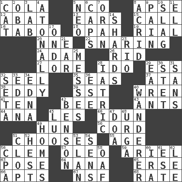 ACROSS 1. Root beer relative 5. Non-commissioned officer (abbr.) 8. Domed church section 12. Blind as ____ 13. Hearing organs 15. Give a ring to 16. Off limits 18. Brightly colored fish 19. Monetary unit of Yemen 20. Compass dir. 22. Catching in a trap 24. First man 26. To free from 27. Old wives' tales, e.g. 28. Wedding promise 29. Curvy letter 32. Sew up the eyelids of hawks and falcons 35. Oceans 37. _ moment's notice (2 wds.) 38. Whirlpool 39. Fast jet (abbr.) 40. Songbird 41. Nine, plus one 42. Fermented drink made from hops 43. Pismires 44. Santa ___, CA 45. French article 46. Goddess of spring and wife of Bragi 49. Attila the _ 50. Drawstring 51. Opts 55. Mature 56. Clement's nick name 57. Margarine 59. Satellite of Uranus 63. Airs 64. Nanny 65. Celtic language 66. Tenement units (abbr.) 67. Overdraft (abbr.) 68. Assign a rank or rating to DOWN 1. Feline 2. Chief or king in Benin or Nigeria 3. Experiment locale 4. Without tonality 5. Modern: prefix 6. Balmoral and tarboosh 7. NW Algerian seaport 8. Bitter 9. Ache 10. Volcanic refuse 11. Pipe bend 14. Pottery fragments 17. Southwest Nigerian state 21. Hearing organ 23. River (Sp.) 25. Makes clutter 28. Of or pertaining to medicine 29. Merit 30. Proofreading order 31. Without 32. Bristle 33. Locale of original sin 34. Pulitzer Prize-winning author Ferber 36. Compass dir. 40. Nomad 42. Gillaume's butler role 45. Nilotic language 47. ___ good deed 48. Capital and largest city of Mongolia 49. Residences 51. Hoof sound 52. Command 53. Enthusiasm 54. Elected reps. 56. Accounting whiz (abbr.) 58. Clumsy lout 60. Lyricist Gershwin 61. Eastern Standard Time (abbr.) 62. Area sheltered from the wind