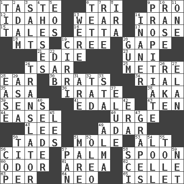 ACROSS 1. Clothes sense 6. Three (prefix) 9. Adept person 12. Potato state 13. Put on (as clothing) 14. SW Asia republic 15. Lies 16. Singer James 17. Characteristic smell of wine 18. Mountains (abbr.) 19. Algonquian 20. Stare wonderingly 21. Singer Brickell 23. University (slang) 24. Russian ruler of old 25. Distance measurement (Brit.) 28. Ewer handle 30. Naughty children 34. Monetary unit of Yemen 35. White ___ sheet 36. Feeling or showing extreme anger 38. Alias (abbr.) 39. Elected reps. 41. Peak District village in England 43. Nine, plus one 44. Artist's stand 46. Goad 48. Area sheltered from the wind 49. The sixth month of the Jewish calendar 50. Bits 51. Undercover agent 53. The first octave above the treble staff 56. Quote 57. Inside of hand 58. Soup utensil 60. Scent 61. Type of rug 62. Cell (Danish) 63. For each 64. Modern: prefix 65. Small island DOWN 1. Teat (slang) 2. First man 3. Table seasoning 4. College papers 5. Greek goddess of the dawn 6. False hair 7. Pace 8. Lyricist Gershwin 9. Appease 10. Raze (variant) 11. Single 13. Past tense of be (plural) 14. Sillier 19. High-altitude cloud 20. Chewing product 22. Small moist lump or mass 24. Interpreter 26. Immoral or dissolute person 27. Style 28. Comfort 29. At sea 31. "We ___ not amused" (Victoria) 32. Small boy 33. R.R. building 37. Dodge 40. Sowing specialist 42. Epoch 45. French article 47. Wine fruits 49. _ mater 50. Event that recurs at intervals 51. Female horse 52. Margarine 54. Hang loosely or laxly 55. Lacquered or enameled metalware 56. Police officer (slang) 57. Baking dish 58. _-fi 59. Fish or hair follower
