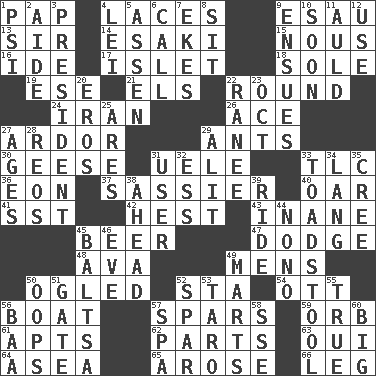 ACROSS 1. Infant food 4. Shoestrings 9. He sold his birthright 13. Title for a knight 14. 1973 Nobel Price Winner (Physics) Leo 15. Common sense 16. Binary compound 17. Small island 18. Not divided or shared with others 19. Compass dir. 21. Raised railways 22. Having a circular shape 24. SW Asia republic 26. Adept person 27. Zeal 29. Pismires 30. Honkers 31. Ubangi River tributary 33. Affectionate concern, for short 36. Age 37. More disrespectful 40. Rowing implement 41. Fast jet (abbr.) 42. Command 43. Empty; void 45. Fermented drink made from hops 47. Evade 48. Actress Gardner 49. Not women's 50. Stared at amorously 52. R.R. building 54. Baseball player Mel 56. Water vessel 57. Practice fights 59. Globe 61. Tenement units (abbr.) 62. Pieces 63. Fr. "Yes" 64. Toward the sea 65. Came up 66. Part of a journey DOWN 1. 23rd letter of the Greek alphabet 2. Assistant 3. Elected leader of a country 4. Luau accessory 5. NE Netherlands city 6. Give a ring to 7. Supplements with great effort 8. Be seated 9. Follows as a consequence or result 10. Within a short period 11. Old (Scot.) 12. Purpose 20. Greek god of love 22. Indian princess (variant) 23. Sep. follower 25. Ancient Greek god of war 27. Grows older 28. Vintage cars 29. Came down and settled, as after flight 31. One who uses or employs something 32. Double-curved letter 33. Inedible or poisonous agaric 34. Long (Scottish) 35. Algonquian 38. Having the leading position 39. Travel on or in a vehicle 44. Words to Nanette 45. Greek mezzo-soprano Agnes 46. Night before a holiday 49. Shops 50. I made a mistake 51. Yard entry 52. Coast Guard woman 53. Pacific island yam 55. Loyal 56. Sound made by sheep 57. Health resort 58. Compass dir. 60. Massive