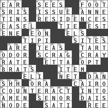 ACROSS 1. Hearing organ 4. Perceives with the eye 8. Pick up the tab 12. Indian titles of respect 14. Come out of 16. Queen of England 1702-14 17. Airtight sealed metal containers 18. Dwellings 20. Artist's stand 22. Standoff 23. Eastern Standard Time (abbr.) 24. Compass dir. 25. A really long time 28. Raised railways 30. Native american tent (variation) 31. Locates 35. "We ___ not amused" (Victoria) 37. Beverages made from leaves 40. Small pie 41. Scent 42. Lean end of the neck 44. Supercomputer manufacturer 45. Assign a rank or rating to 46. Singer James 47. Elect 48. Naughty children 50. A distinct part 52. Connecticut Ivy Leaguer 54. Fish or hair follower 55. One of the 12 tribes of Israel 58. Quiet! 61. Mouth or opening 63. Capital of Egypt 65. Act in opposition 70. To the inside or interior of 71. So be it 72. Sir (Sp.) 73. Raised platform 74. Connecting point 75. Suttee (variant) 76. To sift DOWN 1. First name in cosmetics 2. Believer in; advocate of (suffix) 3. Remove soap 4. Title for a knight 5. Compass dir. 6. Curvy letter 7. Set of matching outer garments 8. Air blower 9. Single time 10. Singles 11. Trial 13. Compass dir. 15. Singer Brickell 19. Snakelike fish 21. Luau accessory 26. Elects 27. Sibling's daughter 29. "Cheers" or "Ellen" 30. Cylindrical with tapered ends 32. Canvas cover 33. Part of Q.E.F. 34. Filthy place 35. The sixth month of the Jewish calendar 36. Round or rotation of duties 38. Nonscientific branch of learning 39. Smooth fabric 41. Globe 43. Yard entry 49. Narrow, elongated depression 51. And so on (abbr.) 53. Angers 55. Middle Eastern gold or silver currency 56. Nick name for Arthur 57. Trap for birds or small mammals 58. Examine minutely or intensely 59. Like (prefix) 60. Took on color 62. Ancient Greek god of war 64. Assist 66. Compass dir. 67. Santa ___, CA 68. Small bed 69. Three (prefix)