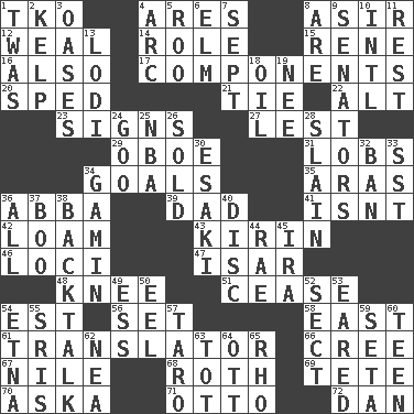 ACROSS 1. Ring climax 4. Ancient Greek god of war 8. SW Saudi Arabia district 12. Welt 14. Hero or heavy, e.g. 15. French philosopher Descartes 16. In addition 17. Pieces 20. Hurried 21. Make a knot 22. The first octave above the treble staff 23. Omens 27. For fear that 29. Mitch Miller's instrument 31. Tennis shots 34. Finish lines 35. Ancient river in northeast Turkey 36. Swedish rock group 39. June honoree 41. Is not 42. Rich soil 43. Japanese brewing company 46. Event scenes 47. Austrian river, tributary to the Danube 48. Leg joint 51. Stop 54. Eastern Standard Time (abbr.) 56. Put into a specified state 58. Compass direction 61. Interpreter 66. Algonquian 67. The longest river in the world 68. Writer of Portnoy's Complaint (1969) 69. Wig 70. "____ silly question..." 71. Von Bismarck 72. Daniel's nick name DOWN 1. It was, poetically 2. Seaweed 3. Fertile tracts in a desert 4. Curve 5. Friend of Pooh 6. Shade tree 7. Back-to-school mo. 8. "We ___ not amused" (Victoria) 9. Legislators 10. International (abbr.) 11. Remainder 13. Farming town in central California 18. Lubricate 19. Born 24. Thick or sticky substance 25. Basketball assoc. 26. Exchanged or delivered for money 28. Killed 30. 1973 Nobel Price Winner (Physics) Leo 32. Prohibit 33. Fast jet (abbr.) 34. Street urchin 36. Everything 37. Sometimes accompanies a hiss 38. Sass 40. Flat circle 44. Actress Charlotte 45. Lyricist Gershwin 49. Curvy letter 50. Snakelike fish 52. Religious group 53. Having ears or earlike features 54. Inactive volcano in Sicily 55. Indian titles of respect 57. Pacific island yam 59. Stalk of a moss capsule 60. Adolescent 62. Teachers' org. 63. Small child 64. Baseball player Mel 65. 17th letter of the Greek alphabet