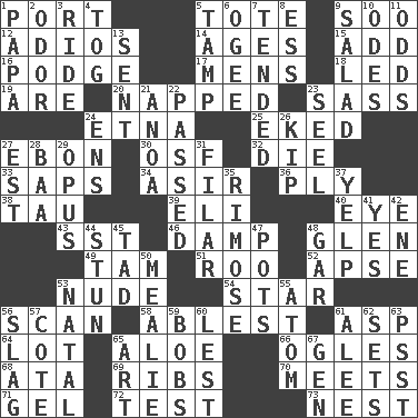 ACROSS 1. Left side of a ship or aircraft 5. Haul 9. "Barney Miller" actor Jack 12. Goodbye (Sp.) 14. Matures 15. Say or write further 16. Puddle 17. Not women's 18. Directed 19. "We ___ not amused" (Victoria) 20. Slept 23. Backtalk 24. Inactive volcano in Sicily 25. Made supply last 27. Inky black, to poets 30. Order of Saint Francis (abbr.) 32. Expire 33. Plant excrements 34. SW Saudi Arabia district 36. Apply oneself diligently 38. The 19th letter of the Greek alphabet 39. Biblical high priest 40. Sight organ 43. Fast jet (abbr.) 46. Moist 48. Small, secluded valley 49. Scottish cap 51. Friend of Pooh 52. Domed church section 53. Unadorned 54. Play the lead 56. Examine hastily 58. Most capable 61. Cleo's killer 64. Car dealer's back yard 65. _ vera 66. Stares at amorously 68. _ moment's notice (2 wds.) 69. Teases 70. Confronts 71. Set 72. Trial 73. Egg locale DOWN 1. Dad 2. Aroma 3. Travel on an animal 4. Coat; cloak 5. Pack (down) 6. Double curve, resembling the letter S 7. Watched over 8. Double-curved letter 9. Vegetable dish 10. Lyric poems 11. Probability 13. Emitted 21. Small Philippine buffalo 22. Went by 23. Stitch closed the eyes of (a falcon) 24. Followers of ems 26. Sleep 27. Eastern Standard Time (abbr.) 28. Sound made by sheep 29. Musical composition 31. Of or pertaining to a thread or threads 35. Full of chinks, cracks, or crevices 37. Sharp bark 41. Affirmative reply 42. Compass dir. 44. Surprise greatly 45. Bit 47. Plant holders 48. Slender fish 50. Ear of corn 53. Relating to or accompanying birth 55. Smallest unit of an element 56. Volcanic refuse 57. ____ d'Azur (French Riviera) 59. Moves up and down 60. For fear that 61. Toward shelter 62. Arranges properly for use 63. Inconspicuous attention getter 65. Tate display 67. Commissioned mil. rank