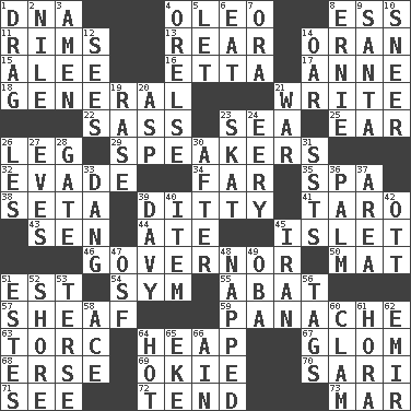 ACROSS 1. Heredity factor (abbr.) 4. Margarine 8. Double-curved letter 11. Basketball hoops 13. Posterior 14. NW Algerian seaport 15. Toward shelter 16. Singer James 17. Queen of England 1702-14 18. Commissioned military rank 21. Compose 22. Backtalk 23. Ocean 25. Hearing organ 26. Part of a journey 29. Orators 32. Dodge 34. At a great distance 35. Health resort 38. Stalk of a moss capsule 39. Short, simple song 41. Edible starchy tuberous root 43. Elected rep. 44. Had dinner 45. Small island 46. State head 50. Floor covering 51. Eastern Standard Time (abbr.) 54. Symbol (abbr.) 55. Blind as ____ 57. Bundle of cut stalks of grain 59. Flamboyance 63. Torque (variant) 64. Pile 67. Take by theft 68. Celtic language 69. Migrant worker of the '30s 70. Indian skirt 71. Perceive with the eye 72. Be inclined (to) 73. Impair DOWN 1. To trail on the ground 2. "Death on the ____" 3. So be it 4. Threatening words 5. Allow 6. Ingest 7. Mouth or opening 8. Bert's buddy 9. Before Barbara or Clara 10. Scornful expression 12. Observes 14. Rowing implement 19. Raze (variant) 20. Cleo's killer 21. Armed conflict 23. Three-handed card game 24. Suggestive of the supernatural 26. French article 27. Nights before holidays 28. Yard entry 30. Following 31. Fast planes 33. Mild oath, euphamism for damn 36. Inside of hand 37. Length times width 39. American folk hero Crockett 40. A distinct part 42. Baseball player Mel 45. SW Asia republic 47. Order of Saint Francis (abbr.) 48. Slept 49. Chief or king in Benin or Nigeria 51. _____ Park, CO 52. Dinah or Pauly 53. Laconic 56. Labels 58. Adept person 60. Dollar (slang) 61. Israeli folk dance 62. Independent ruler or chieftain 64. Being at a high temperature 65. Make supply last 66. The 18th letter of the Arabic alphabet