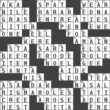 ACROSS 1. Alias (abbr.) 4. Argument over a trivial matter 8. Put on (as clothing) 12. The longest river in the world 14. Ethiopian city, capital of Harari 16. Pulitzer Prize-winning author Ferber 17. Pate de foie ____ 18. Pleas 20. 61 cubic inches 22. Fenced enclosure 23. She-sheep 24. Single 25. Snakelike fish 28. Enemy 30. Past tense of be (plural) 31. At full speed 35. R.R. building 37. Indian skirt 40. Otherwise 41. Fermented drink made from hops 42. Eat (away) 44. Hero or heavy, e.g. 45. Detail 46. Christmas carol 47. Unit of force equal to gravity 48. Before Barbara or Clara 50. Helper 52. Part of HMS, perhaps 54. Lion 55. Afternoon social gathering 58. White ___ sheet 61. Fool 63. Rhinal 65. Complicated, petty procedures 70. Jacques of French films 71. Algonquian 72. Came up 73. Arabian gulf 74. Behest 75. Singer James 76. Compass dir. DOWN 1. White American of non-Hispanic descent 2. Japanese brewing company 3. Having winglike extensions 4. A female animal or person 5. Baking dish 6. Nonscientific branch of learning 7. Canvas cover 8. Soggy 9. Singer Brickell 10. Afresh 11. To erase 13. Compass dir. 15. Coral collection 19. Small Philippine buffalo 21. To separate or throw off 26. Celtic language 27. Acquire or gain knowledge or skills 29. Develop 30. Heat 32. Medicinal plant 33. Small island 34. Born 35. Stalk of a moss capsule 36. Adolescent 38. Friend of Pooh 39. Standard of perfection 41. Altar cloth linen 43. Writer Wiesel 49. Opera by Verdi 51. Spanish title 53. "Two Mules for Sister ____" 55. Sadhe (variant) 56. Eroded 57. Place in a line 58. Bowlike part 59. Father 60. Ripens 62. Had on 64. _ moment's notice (2 wds.) 66. Was introduced to 67. Car dealer's back yard 68. Eastern Standard Time (abbr.) 69. Ocean