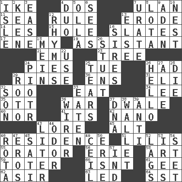 ACROSS 1. Mamie's husband 4. Two (Sp.) 7. Uhlan (variant) 11. Ocean 12. Court order 13. Eat (away) 14. French article 15. Hollow 16. Chalkboards 17. Foe 19. Helper 21. Australian flightless bird 23. Woody plant 24. Sliced desserts 25. Third day of the wk. 26. Possessed 29. Wash lightly 30. Followers of ems 31. Connecticut Ivy Leaguer 32. "Barney Miller" actor Jack 33. Consume 34. Area sheltered from the wind 35. Baseball player Mel 36. Armed conflict 37. A sleeping potion; an opiate (poet.) 40. And not 41. It is 42. Billionth: prefix 43. Old wives' tales, e.g. 45. The first octave above the treble staff 46. Home 51. Ms. Damita and namesakes 55. Speaker 56. One of the Great Lakes 58. Tate display 59. Carrier 60. Is not 61. Turn to the right 62. SW Saudi Arabia district 63. Directed 64. Fast jet (abbr.) DOWN 1. Small island 2. Peachy ____! 3. Comfort 4. Superhero pair 5. Rounded earthenware pot or jar 6. Observes 7. A salt of uric acid 8. Globular water bottle used in Asia 9. An important port of Yemen 10. A home for chicks 12. Poems 13. Otherwise 16. Founders of families 18. Chow _ 20. Difficult or unusual or dangerous feat 22. Purpose 24. Peter (Polish) 25. Separates forcefully 26. Phone greeting 27. Toward shelter 28. Pass on 29. Printing process, for short 32. Male offspring 33. Eroded 36. One who wires 37. Heredity factor (abbr.) 38. Place for singles 39. Opposed to 43. 61 cubic inches 44. Scent 46. Roll call or roster of names 47. Greek god of love 48. Suttee (variant) 49. To provide with a ceiling 50. Celtic language 52. Straggles 53. Angers 54. Proofreading order 57. Working for oneself (abbr.)