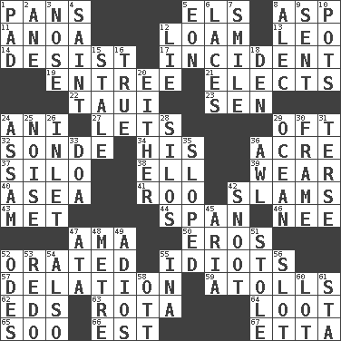 ACROSS 1. Baking dishes 5. Raised railways 8. Viper 11. Small Philippine buffalo 12. Rich soil 13. Lion 14. Stop 17. Event 19. Main course 21. Opts 22. "Change" in Tahitian 23. Elected rep. 24. Black tropical American cuckoo 27. Allows 29. Often (poetically) 32. Message 34. Part of HMS, perhaps 36. Measure of real estate 37. Grain storage tower 38. Pipe bend 39. Erode 40. At sea 41. Friend of Pooh 42. Shuts with force 43. Was introduced to 44. Connect, as a bridge 46. Born 47. Nanny (var.) 50. Greek god of love 52. Spoke pompously 55. Foolish or stupid persons 57. Accusation by an informer 59. Ringlike coral islands and reefs 62. Begley and Asner 63. Round or rotation of duties 64. Spoils 65. "Barney Miller" actor Jack 66. Eastern Standard Time (abbr.) 67. Singer James DOWN 1. Writing tablet 2. A saturated hydrocarbon 3. Characteristic smell of wine 4. Inhabitant of Heaven 5. A really long time 6. Shoestrings 7. Grin 8. Actor Baldwin 9. Emitted 10. Cooking vessels 12. Falsehood 15. Showing deterioration from age 16. Loyal 18. Lair 20. One or the other of two 24. Indian state 25. Annoying sound 26. An arm off of a larger body of water 28. Grain storage towers 29. Sea 30. Movie unit 31. Laconic 33. ___ good deed 35. Slanted 36. Leather borer 42. Snout, nose 45. Roberta Peters solo 47. _ moment's notice (2 wds.) 48. Distance measurement (Brit.) 49. Goodbye (Sp.) 51. Took without asking 52. Lyric poems 53. Redecorate 54. In addition 55. _ tizzy (2 wds.) 56. Groove 58. Baseball player Mel 60. Car dealer's back yard 61. R.R. building