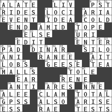 ACROSS 1. Having winglike extensions 6. 54 in ancient Rome 9. Pacific Standard Time (abbr.) 12. Amusement-park features 13. Venues 14. Operatic vocal solo 15. Happening 16. It may be bright or harebrained 17. Having a low temperature 18. Conclusion 19. Among 20. Drink excessively 21. Otherwise 23. RI univ. 24. Prepare for publication 25. Keyboard key 28. Writing tablet 30. Middle Eastern gold or silver currency 34. Grain storage tower 35. Black tropical American cuckoo 36. The wife of a rajah (variant) 38. Small island 39. Tennis shots 41. Honkers 43. Afternoon social gathering 44. Shopping centers 46. Lacquered or enameled metalware 48. Hearing organ 49. French philosopher Descartes 50. Against 51. Ancient Greek god of war 53. Compass dir. 56. Toward shelter 57. Burrowing marine mollusk 58. "_____ Recall" 60. Global Positioning Systems (abbr.) 61. In addition 62. Ascend 63. Curvy letter 64. Actress Charlotte 65. Trials DOWN 1. "We ___ not amused" (Victoria) 2. Moving, as bait 3. An important port of Yemen 4. Looked after 5. Eastern Standard Time (abbr.) 6. Farming town in central California 7. On the rocks 8. By way of 9. Conciliate 10. Drop; flow; fall 11. Bit 13. Welles in "The Third Man" 14. Oak nuts 19. Moving or stirring 20. Third day of the wk. 22. Flaplike covering 24. The property of being fit to eat 26. Writer Wiesel 27. Round or rotation of duties 28. Inside of hand 29. Small Philippine buffalo 31. Tired old horse 32. A saturated hydrocarbon 33. To separate or throw off 37. _____ Park, CO 40. Chalkboards 42. Period of immesurable duration 45. _ Lanka 47. Poe poem 49. San ____ (Riviera town) 50. High mountains 51. Silent film actress Nazimova 52. To erase 54. Nuclear Threat Initiatives 55. 90 degrees 56. Mature 57. Auto 58. Make lace 59. French article