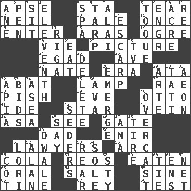 ACROSS 1. Domed church section 5. R.R. building 8. Pull into pieces 12. Famous astronaut Armstrong 13. Diluted with white 15. Single time 16. Keyboard key 18. Ancient river in northeast Turkey 19. Legendary monster 20. Compete 22. Photo 24. Mild oath 26. "___ Maria" 27. Nathan's nickname 28. Epoch 29. "One Day ___ Time" 32. Blind as ____ 35. Desk light 37. Actress Charlotte 38. Expression of disdain 39. First lady 40. Von Bismarck 41. Binary compound 42. Play the lead 43. Distinctive style or manner 44. White ___ sheet 45. Perceive with the eye 46. Yard entry 49. June honoree 50. Independent ruler or chieftain 51. Those who practice law 55. Curve 56. Root beer relative 57. Vintage cars 59. Eroded 63. Taken by mouth 64. Table seasoning 65. Trig term 66. Prong on a fork 67. Marina Del _, California 68. Trial DOWN 1. One (Scot) 2. Fenced enclosure 3. Be seated 4. Veterans Day date 5. Health resort 6. Canvas cover 7. Mountain range southwest of Kyrgyzstan 8. Woman's close-fitting hat 9. Engineer (abbr.) 10. 43,560 square feet 11. To riddle 14. Fortification 17. Capital of Latvia 21. Consume 23. Federal power corp. 25. Erase 28. Develop 29. Johnson of "Laugh-In" 30. Jacques of French films 31. Age 32. Capital of Western Samoa 33. Auction offers 34. At sea 36. Actress Gardner 40. Cloudy 42. Spring feasts 45. Declare 47. Housemaid (var.) 48. Become fatigued 49. A sleeping potion; an opiate (poet.) 51. Australian parrot (variant) 52. ____ Jay Lerner 53. Tail end 54. Flatfish 56. Small bed 58. Filthy place 60. Make a knot 61. Followers of ems 62. Fish or hair follower