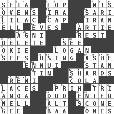 ACROSS 1. Stalk of a moss capsule 5. Chop off 8. Mountains (abbr.) 11. Baking chambers 13. Lyricist Gershwin 14. Indian skirt 15. Pale purple color 16. Head covering 17. SW Asia republic 18. Pipe bend 19. Nights before holidays 21. Nick name for Arthur 22. Hindu god of fire 24. Remainder 25. Erase 27. Perceive with the eye 29. Migrant worker of the '30s 30. Utah city north of Ogden 32. Observes 33. Putting into practice 35. American tennis player Robert 39. World-weariness 41. Comedian Laurel of Laurel & Hardy 42. Metal container 43. Broken pieces 45. Painter Guido (1575-1642) 48. Root beer relative 49. Shoestrings 50. Demure 52. Three (prefix) 55. Small Philippine buffalo 56. Superhero pair 57. Keyboard key 59. 1994 drama film starring Jodie Foster 60. Keyboard modifier key 61. Biscuitlike quick bread 62. Unit of force equal to gravity 63. Sound made by sheep 64. Singles DOWN 1. Not divided or shared with others 2. Morally bad or wrong 3. Copy Pinocchio 4. Santa ___, CA 5. Louse (plural) 6. Mouths or openings 7. Infant food 8. Shops 9. Distinguishing feature 10. Trig term 12. Aroma 14. Title for a man of rank and authority 20. Compete 21. Type of rug 23. Honkers 25. Two (Sp.) 26. Make supply last 27. Male child 28. Oval reproductive body of a fowl 30. Cards in a Roman deck? 31. Rhinal 33. University (slang) 34. Player for Phoenix 36. Ski resort town in Vermont 37. Possessed 38. Followers of ems 40. Nuclear Threat Initiatives 43. _-fi 44. Residences 45. The wife of a rajah (variant) 46. Learning spot: Fr. 47. Anneal 49. Austrian-born American filmmaker Fritz 50. Monetary unit of Botswana 51. Roll call or roster of names 53. French philosopher Descartes 54. Angers 56. Small moist lump or mass 58. Non-commissioned officer (abbr.)