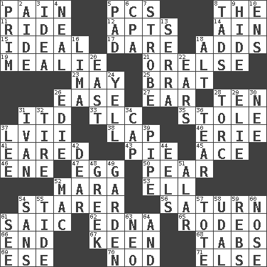 ACROSS 1. Ache 5. Personal Computers (abbr.) 8. Definite Article 11. Travel on an animal 12. Flats, for short 14. The 18th letter of the Arabic alphabet 15. Standard of perfection 17. Have the gumption 18. Does sums 19. Ear of corn 21. Threatening words 23. Can I? 25. Naughty child 26. Comfort 27. Ewer handle 28. "___ Little Indians" 31. It would 33. Affectionate concern, for short 35. Took without asking 37. 57 in ancient Rome 38. Infant locale 40. 4th largest of the Great Lakes 41. Having ears or earlike features 43. Sliced dessert 45. Adept person 46. Compass dir. 47. Ovum 50. Lightbulb-shaped fruit 52. Hindu Mythology: god of death 53. Pipe bend 54. A viewer who gazes fixedly 56. Titan orbits this 61. Ketch in the Levant 62. Pulitzer Prize-winning author Ferber 65. Cowboy competition 66. Conclusion 67. Peachy ____! 68. Bar bills 69. Compass dir. 70. Lower and raise head in agreement 71. Otherwise DOWN 1. Demure 2. Assistant 3. The main thing one is thinking about 4. Be tempered by heat 5. Groovy apt. 6. Tax preparer (abbr.) 7. Disco prop 8. Small amounts or degrees 9. Flintstone garb 10. Followers of ems 13. Spanish missionary in California 16. Pale green bean 18. Keyboard modifier key 20. Compass direction 22. Hearing organs 24. Shout 26. Singer Brickell 28. Torque (variant) 29. Writer Wiesel 30. Born 31. _ the terrible 32. Hoop that covers a wheel 34. Head covering 36. Lacerate 37. Area sheltered from the wind 39. Corncob 42. Letter starter 44. Snakelike fish 48. Hellenic 49. Place where plants grow 51. Having or resembling wings 52. Apple computer (short form) 54. Without 55. Event that recurs at intervals 57. Haul 58. Allodial 59. Confederate soldiers (slang) 60. Characteristic smell of wine 61. Observe 63. Modern: prefix 64. Added to