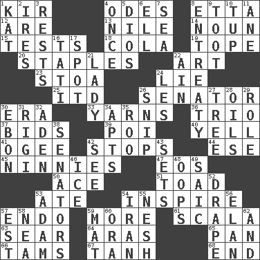 ACROSS 1. Apertif with cassis 4. Lyric poems 8. Singer James 12. "We ___ not amused" (Victoria) 13. Mediterranean tributary 14. Part of speech 15. Trials 18. Root beer relative 19. Drink excessively 20. Paper fasteners 22. Tate display 23. Portico 24. Falsehood 25. It would 26. Legislator 30. Period 33. Entertaining tales 36. Musical group of three 37. Auction offers 39. Luau course 40. Shout 41. Double curve, resembling the letter S 42. Closes up, plugs up 44. Compass dir. 45. Simpletons 47. Greek goddess of the dawn 50. Adept person 51. Frog relative 53. Had dinner 54. Motivate 57. Inside; within (prefix) 59. Greater amount 61. Any of the three canals of the cochlea 63. Wither 64. Caspian sea tributary 65. Baking dish 66. Scottish caps 67. Hyperbolic tangent 68. Conclusion DOWN 1. Krazy ___ of comics 2. Angers 3. Musical pauses 4. At one time in the past 5. "Vaya con ____" 6. Pipe bend 7. Ocean 8. Plea 9. A blast of a horn 10. Uncastrated adult male sheep 11. One (Scot) 16. Jacques of French films 17. Blemish 21. Kenny Rogers chart-topper in '80 22. The 18th letter of the Arabic alphabet 24. French article 26. Sever or remove by pinching or nipping 27. Woody plant 28. Petroleums 29. Hero or heavy, e.g. 30. Inky black, to poets 31. Swiss mountan, "Queen of the Mountains" 32. Arabian gulf 34. Tenement units (abbr.) 35. Friend of Pooh 38. Legislators 42. Observe 43. Puts into a specified state 46. Frozen water 48. I made a mistake 49. Ketch in the Levant 52. Window treatment 53. First man 54. SW Asia republic 55. Soft 56. Enthusiasm 57. Eastern Standard Time (abbr.) 58. Teachers' org. 59. Floor covering 60. Mouth or opening 62. Added to