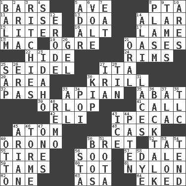 ACROSS 1. Taverns 5. "___ Maria" 8. Parent Teacher Assoc. 11. Ascend 13. ___ good deed 14. Having or resembling wings 15. 61 cubic inches 16. The first octave above the treble staff 17. Unable to walk 18. Big _ 19. Legendary monster 21. Fertile tracts in a desert 22. Flintstone garb 24. Basketball hoops 25. Beer mug 27. Call ___ day 29. Length times width 30. The principal food of baleen whales 32. Romantic infatuation 33. Bee-related 35. Blind as ____ 39. Lowest deck of a ship 41. Give a ring to 42. Biblical high priest 43. Medicinal drug used to evoke vomiting 45. Smallest unit of an element 48. Keg 49. U. of Maine site 50. Cy Young winner Saberhagen 52. Make lace 55. Become fatigued 56. "Barney Miller" actor Jack 57. Peak District village in England 59. Scottish caps 60. Small child 61. Thermoplastic polyamide 62. Single 63. White ___ sheet 64. Supplemented with great effort DOWN 1. Lip ointment 2. Operatic vocal solo 3. Actors Guy, Robert Welles, and Clint 4. Compass dir. 5. The sixth month of the Jewish calendar 6. Grand slam 7. Consume 8. Suffix with ecto or cyto 9. Makes less strong or intense 10. Ancient Greek god of war 12. Wear away 14. Jai _ 20. Set 21. Relating to the mouth 23. Potato state 25. Plant excrement 26. Period 27. Retirement account (abbr.) 28. Shallow baking pan 30. Monetary unit of Laos 31. Shoestrings 33. Everything 34. Luau course 36. Sass 37. Wing 38. Affectionate concern, for short 40. San ____ (Riviera town) 43. Frozen water 44. Eucharist need 45. Believer in; advocate of (suffix) 46. Singer Mel 47. Singles 49. "Beetle Bailey" pooch 50. Scornful sounds 51. Roll call or roster of names 53. Medicinal plant 54. Be inclined (to) 56. R.R. building 58. Color